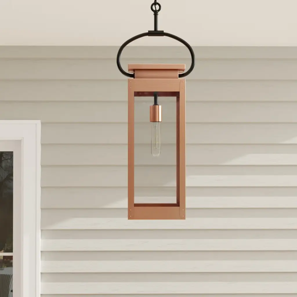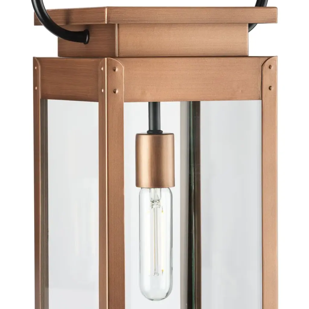 Taking its inspiration from vintage gas lanterns, this light has a timeless antique copper finish that graciously complements its clear flat glass panels. Mechanical details provide character to the form.