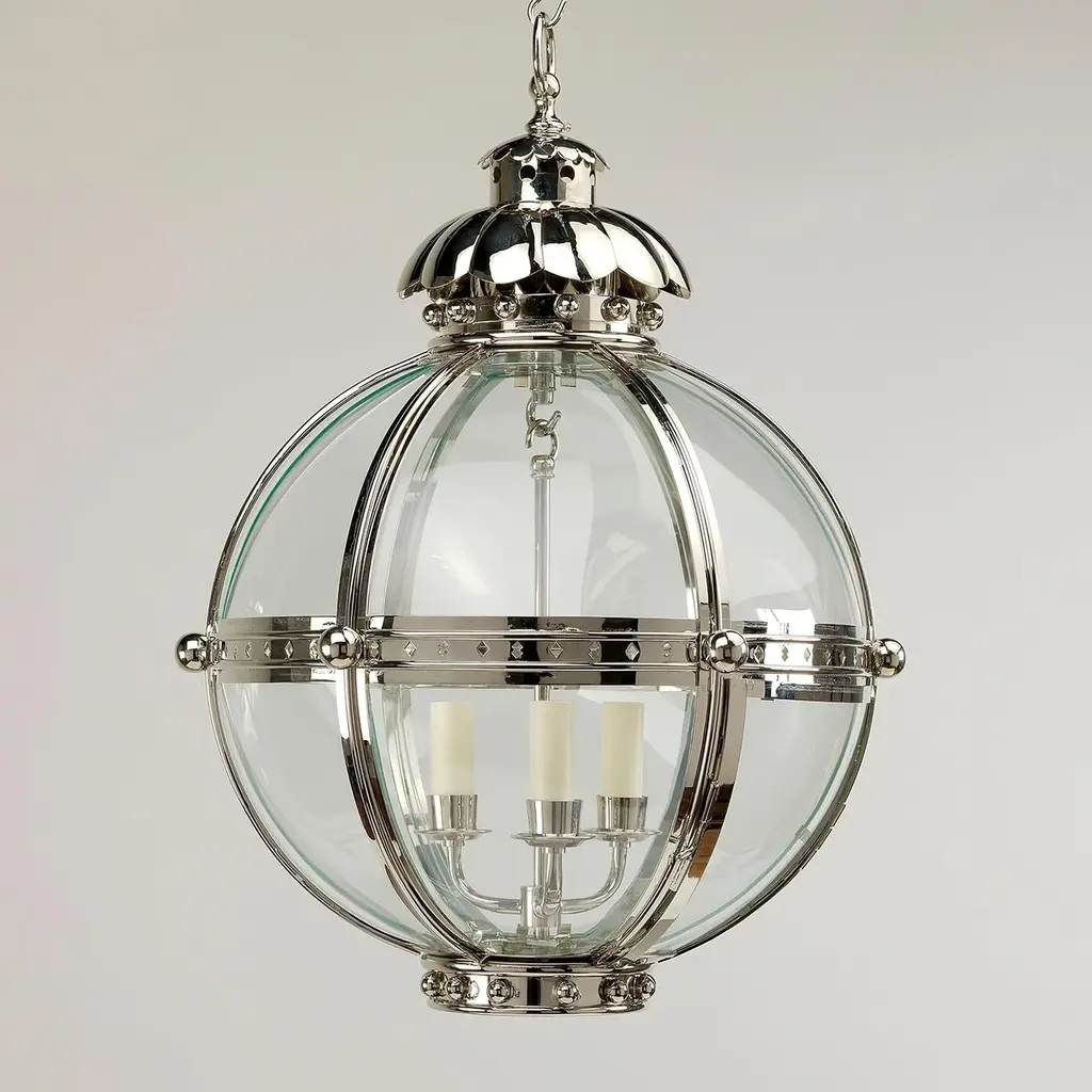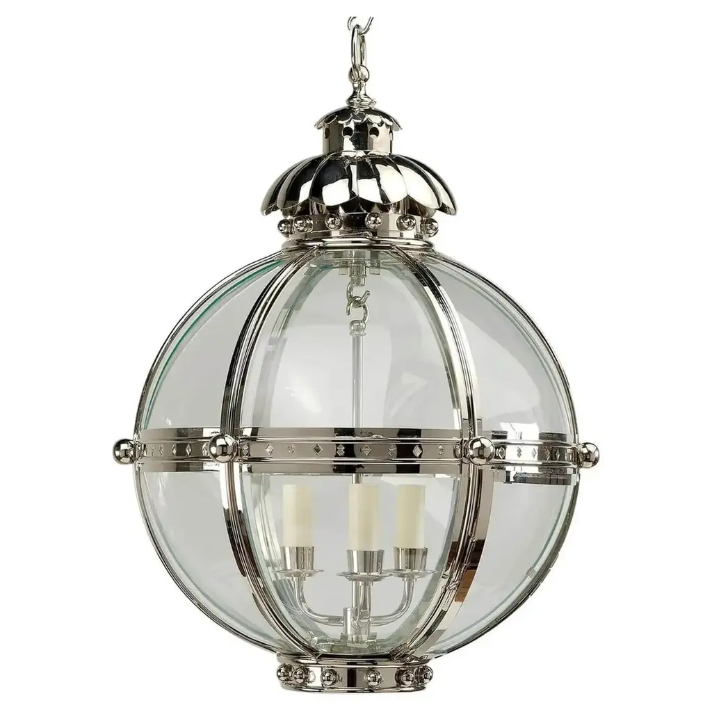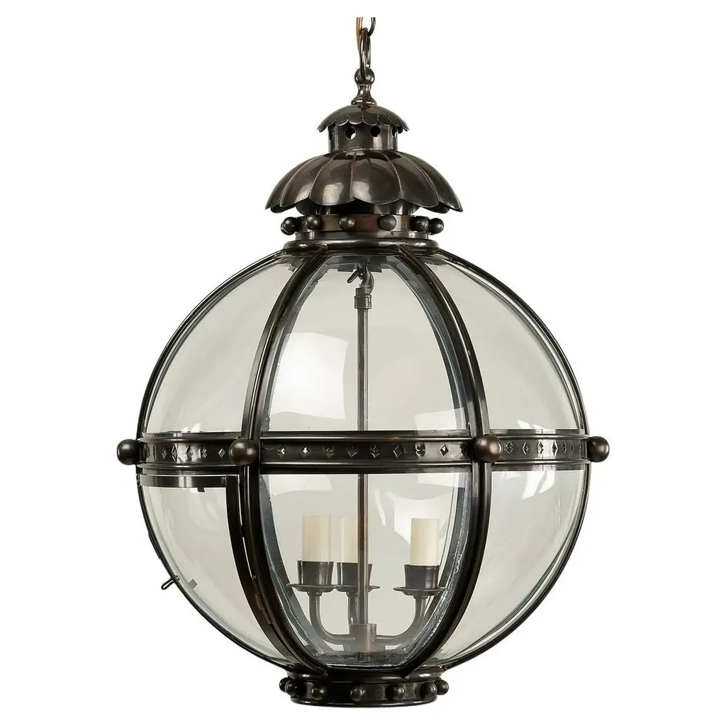 The Globe Lantern is based on a similar 19th-century antique. The globe shape of the fixture emanates strength and is united by the nickel finish finials and acanthus top. The lantern is hand-fabricated from brass and curved glass panels. The lantern is designed for internal use and is often selected for passageways or hallways. The decorative details are formed in nickel-brass and the top is decorated with foliage beneath a petal-shaped smoke cap and a beaded collar. Dimensions: 18" W x 18" D x 24" H Available in a zinc, bronzed or nickel finish in my shop. Supplied with 39” of chain.