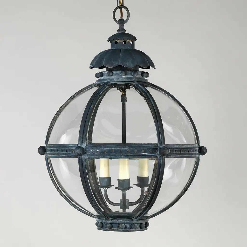 The Globe Lantern is based on a similar 19th-century antique. The globe shape of the fixture emanates strength and is united by the solid zinc finish finials and acanthus top.The lantern is hand-fabricated from bronzed brass and curved glass panels. The lantern is designed for internal use and is often selected for passageways or hallways.The decorative details are formed in bronzed brass and the top is decorated with foliage beneath a petal-shaped smoke cap and a beaded collar.Dimensions: 20" W x 20" D x 28" HAvailable in a zinc, bronzed or nickel finish.Supplied with 39” of chain.