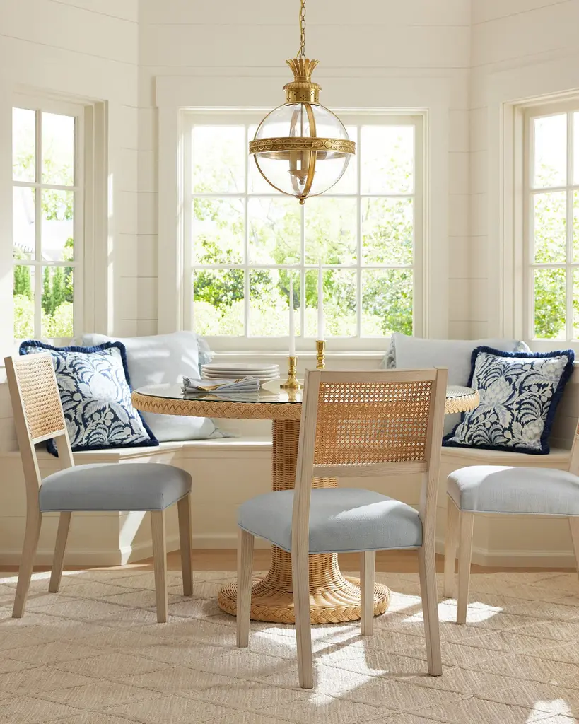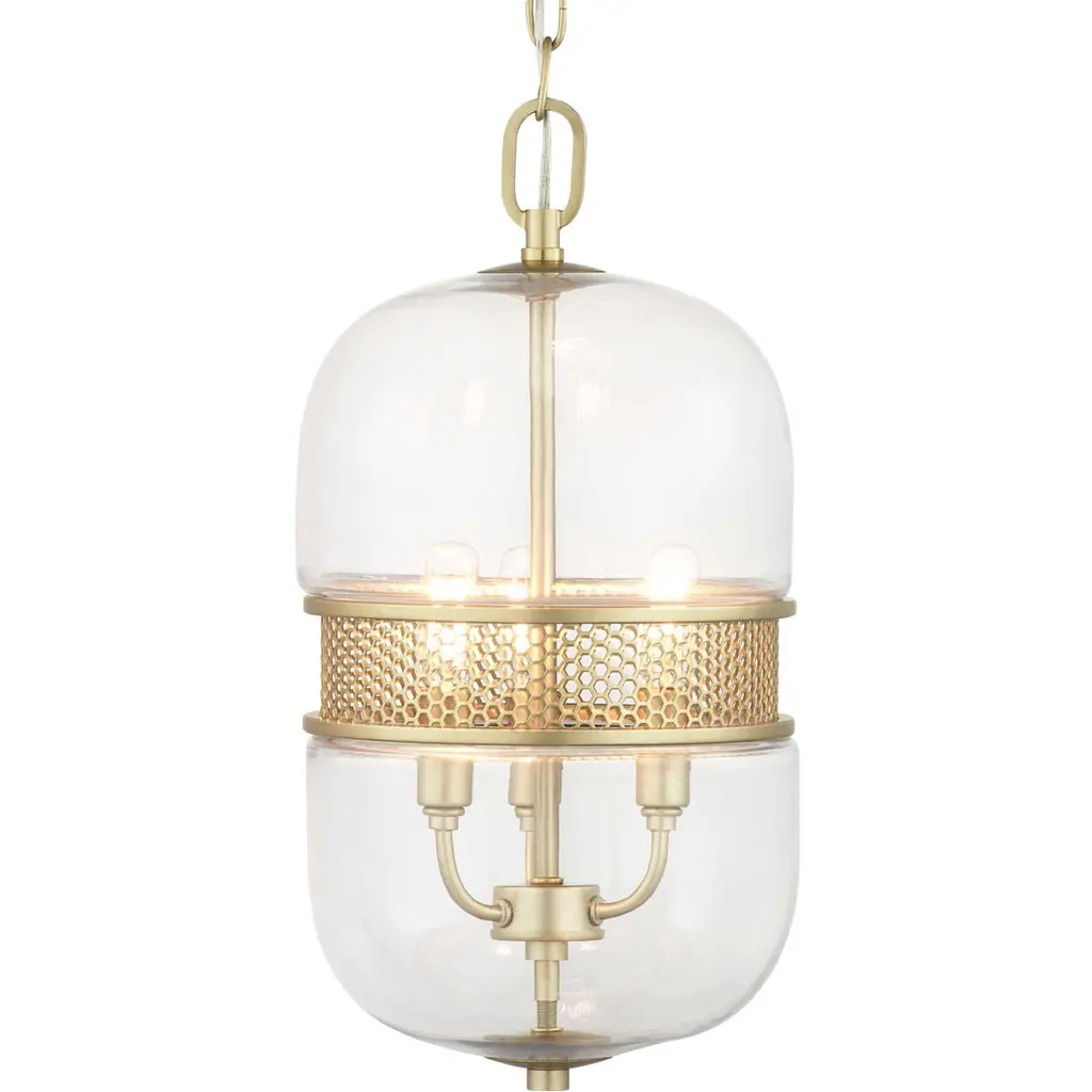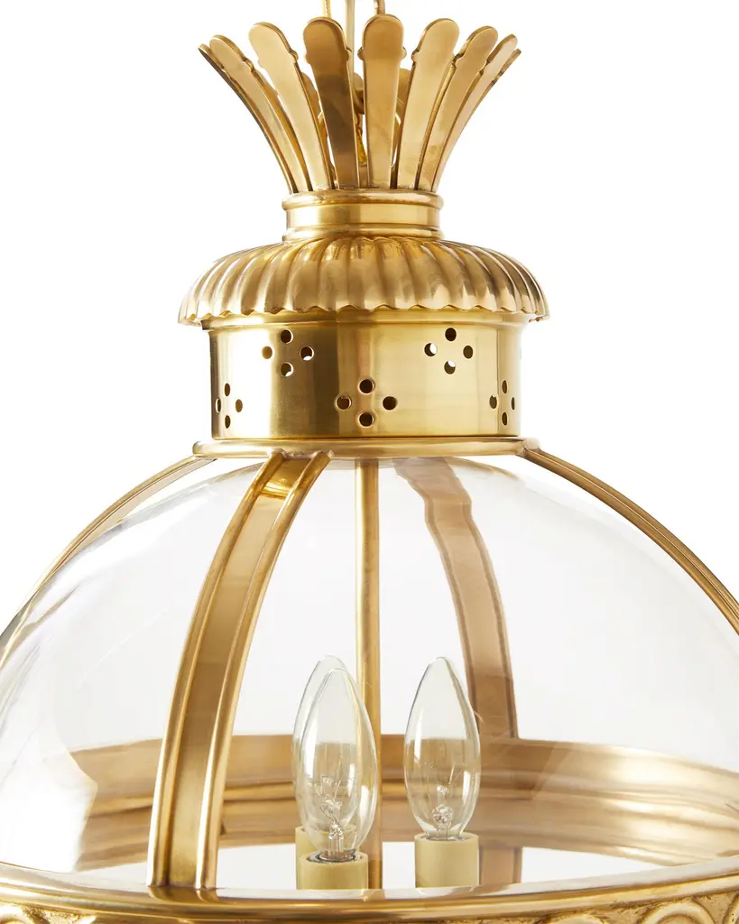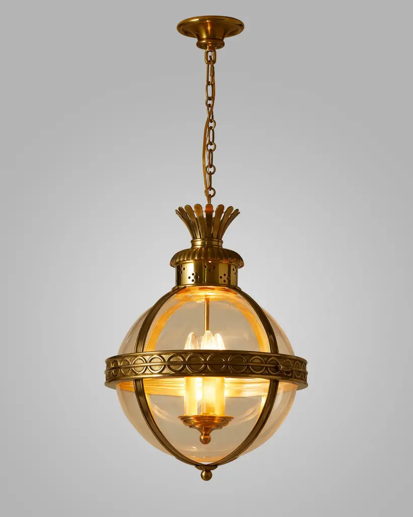 A crowning moment in brass and glass. With the elegance of an antique pendant necklace and a nod to the Sovereign's Orb, it brings a touch of regality to the room. Try it in the foyer or in pairs above the kitchen island.