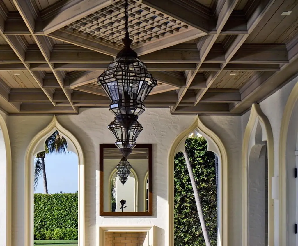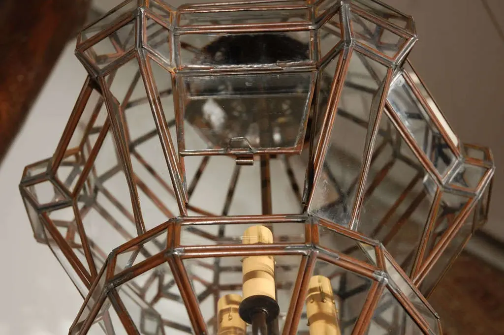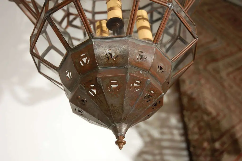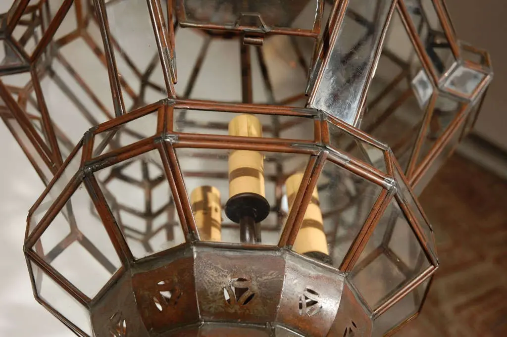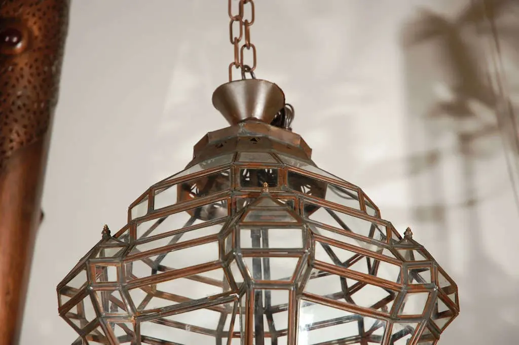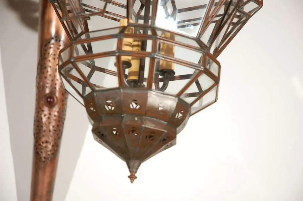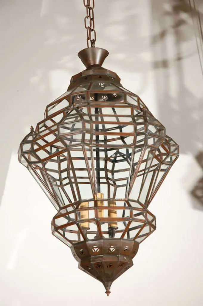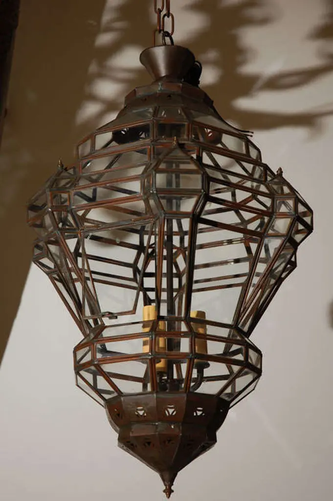 Elegant Moroccan Moorish diamond shape clear glass pendant with bronze metal finish, has a small window to access the inside to change bulbs.Rewired with a cluster of three lights.Handcrafted in MoroccoEleven different levels with multifaceted panels of cut-glass.DIMENSIONS18ʺW × 18ʺD × 27ʺL