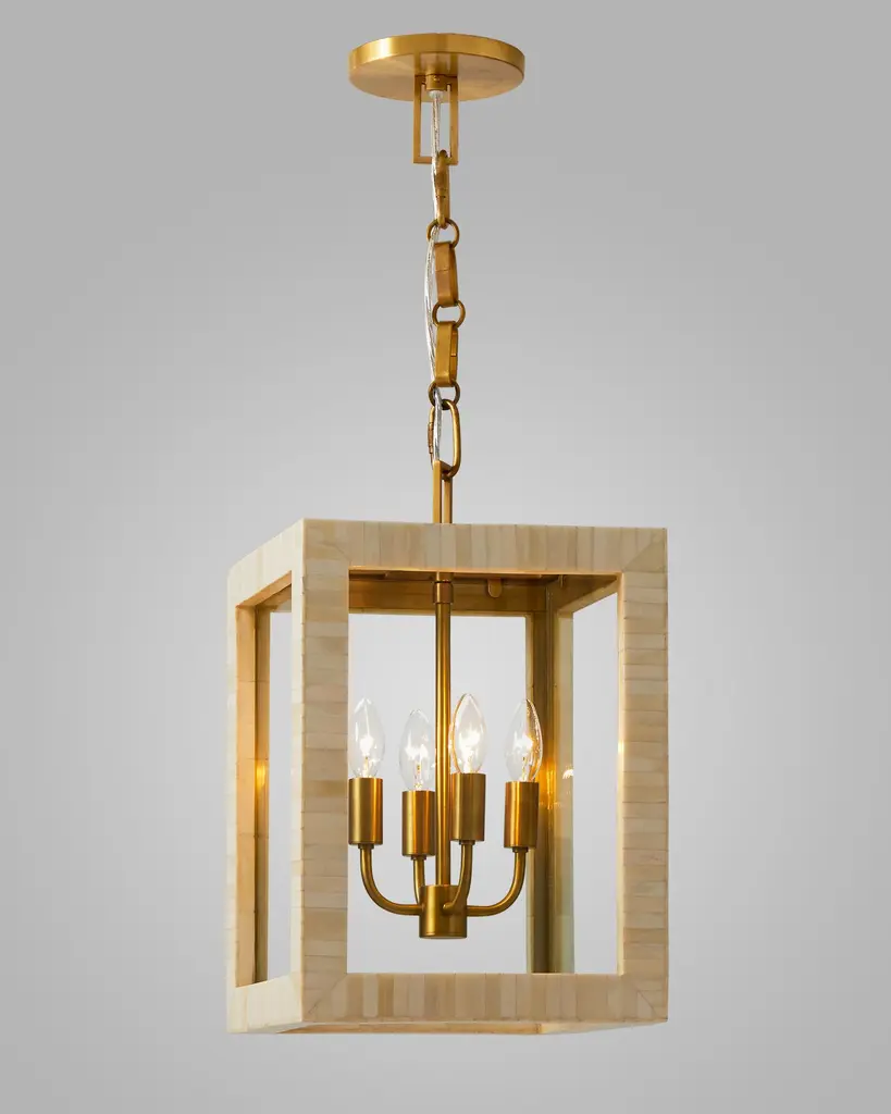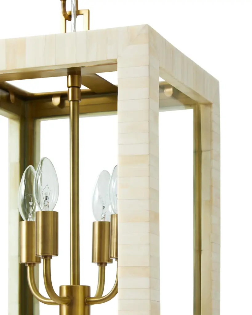 The classic lantern, reignited. Framed by hand-carved bone tiles, this has striking dimension. Light glimmers from the brass interior — golden hour at your fingertips.