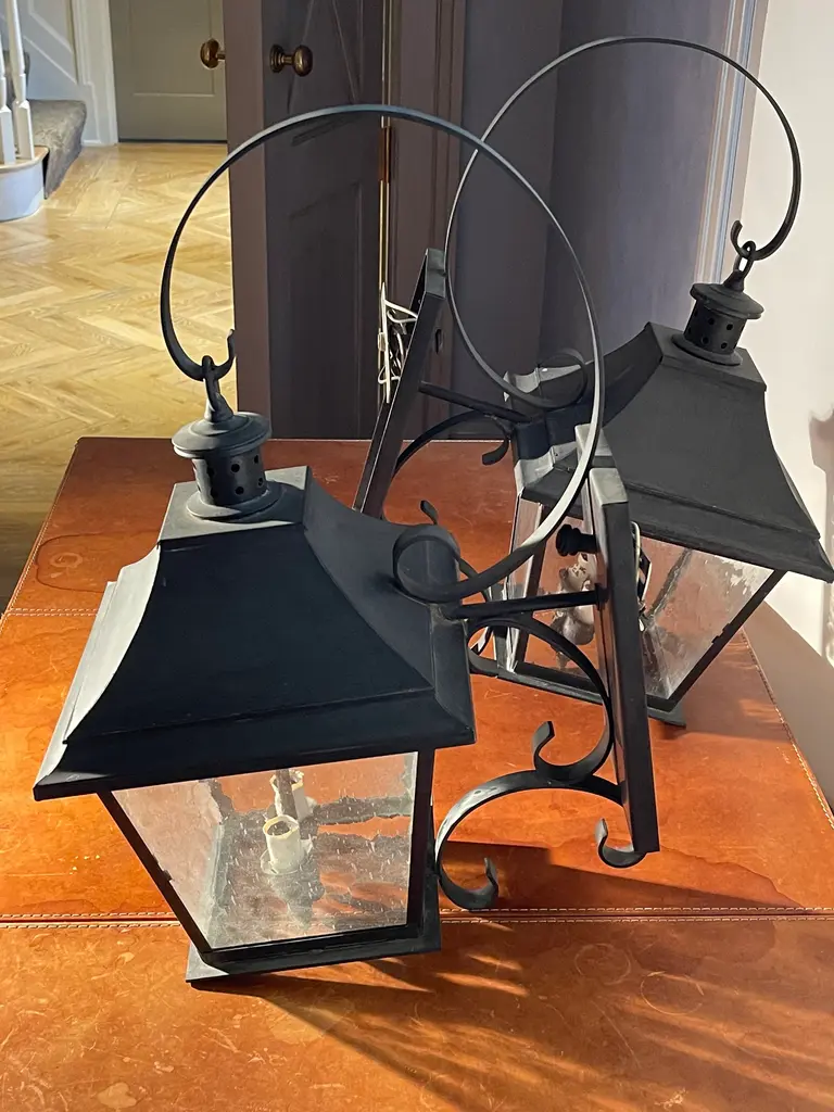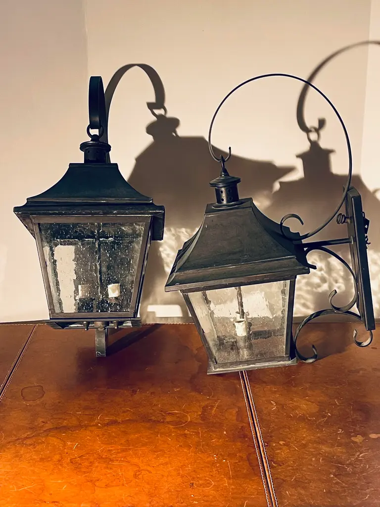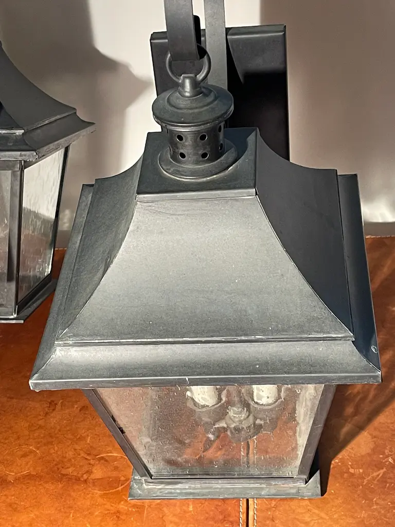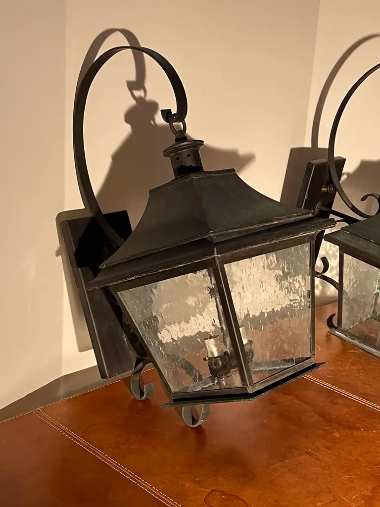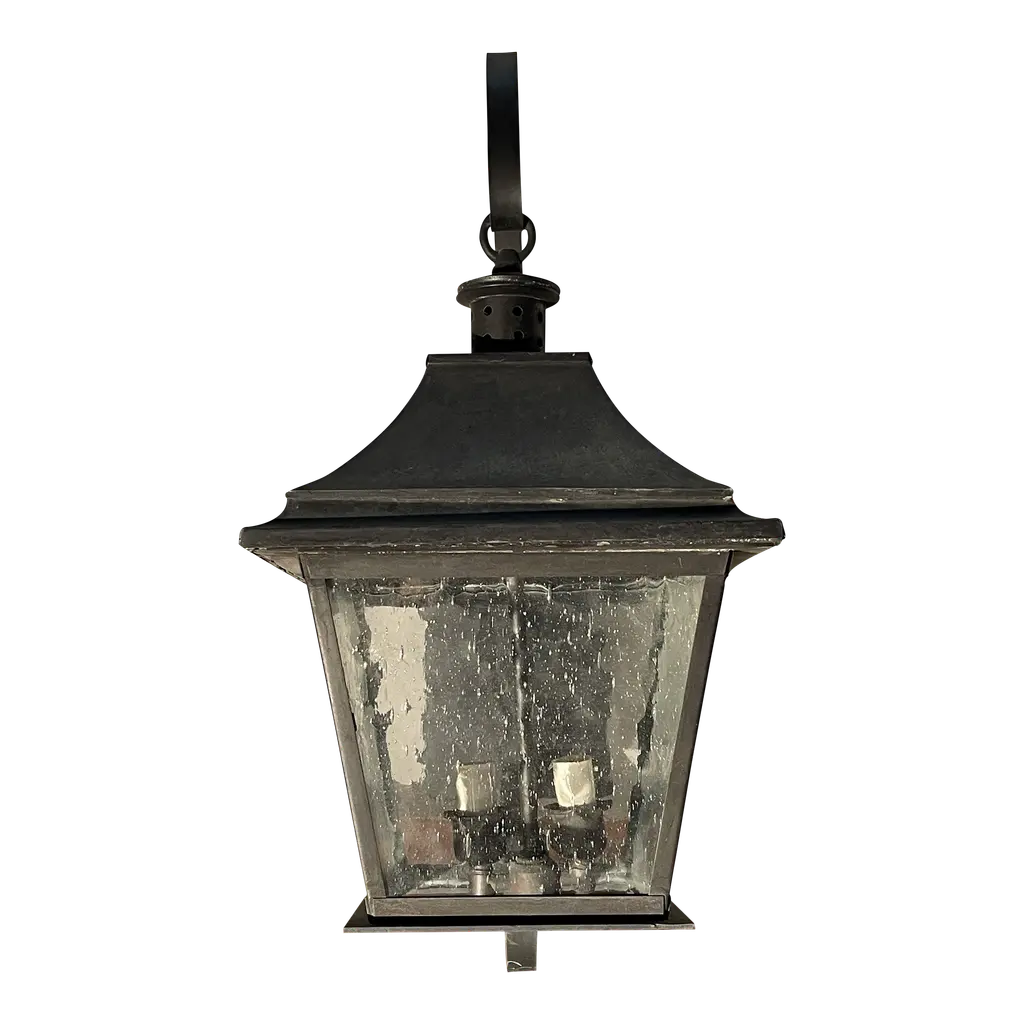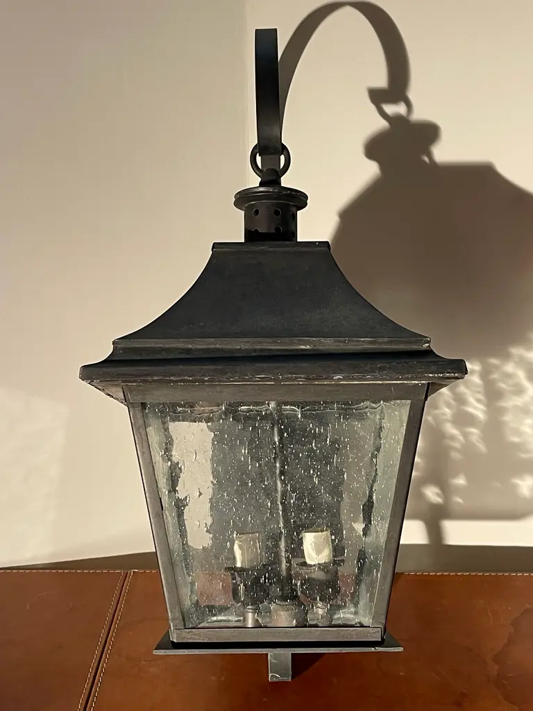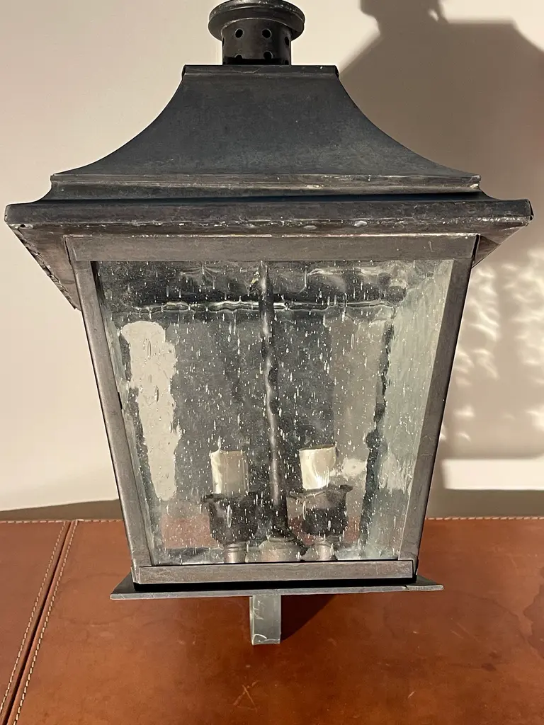 Beautiful 100% copper and seeded glass 2 light outdoor wall lantern From the 883 series, this lantern is timeless. Dark grey brass finish with copper green high lites Selling separately, but 2 are available. 60 watt per bulb dimensions total depth 15" length 10 1/4" height 22" back plate dimensions 5"x 10" tall available today retail $1600 per lantern