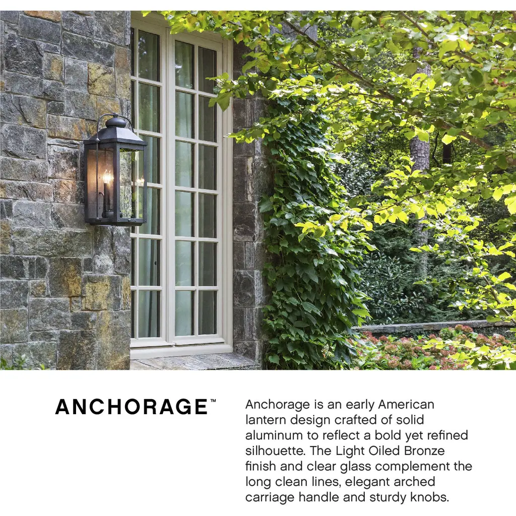 The Heritage Collection encompasses premium outdoor fixtures that pay tribute to the nostalgia of America's past while reinforcing Hinkley's philosophy of timeless, quality design. Anchorage is an early American lantern design crafted of solid aluminum to reflect a bold yet refined silhouette. The Light Oiled Bronze finish and clear glass complement the long clean lines, elegant arched carriage handle and sturdy knobs, resulting in a vintage style with classic charisma.