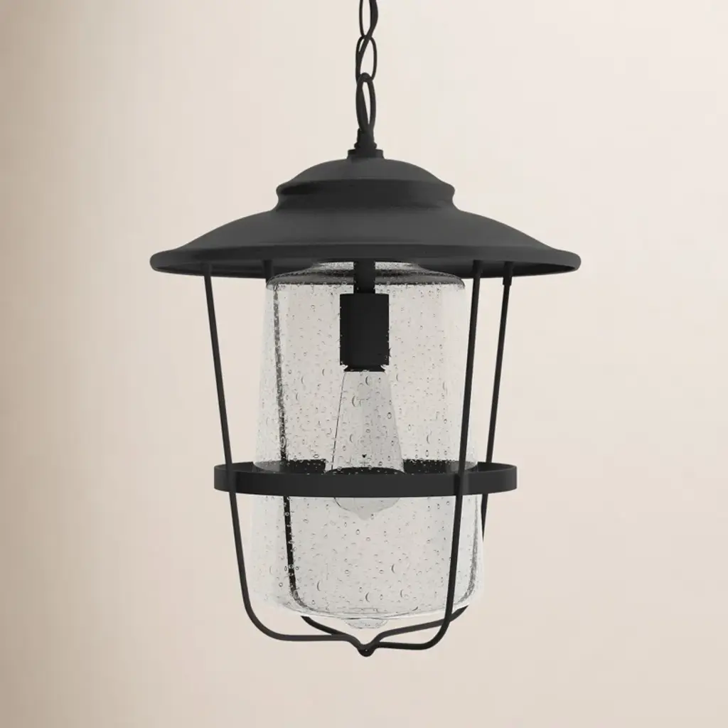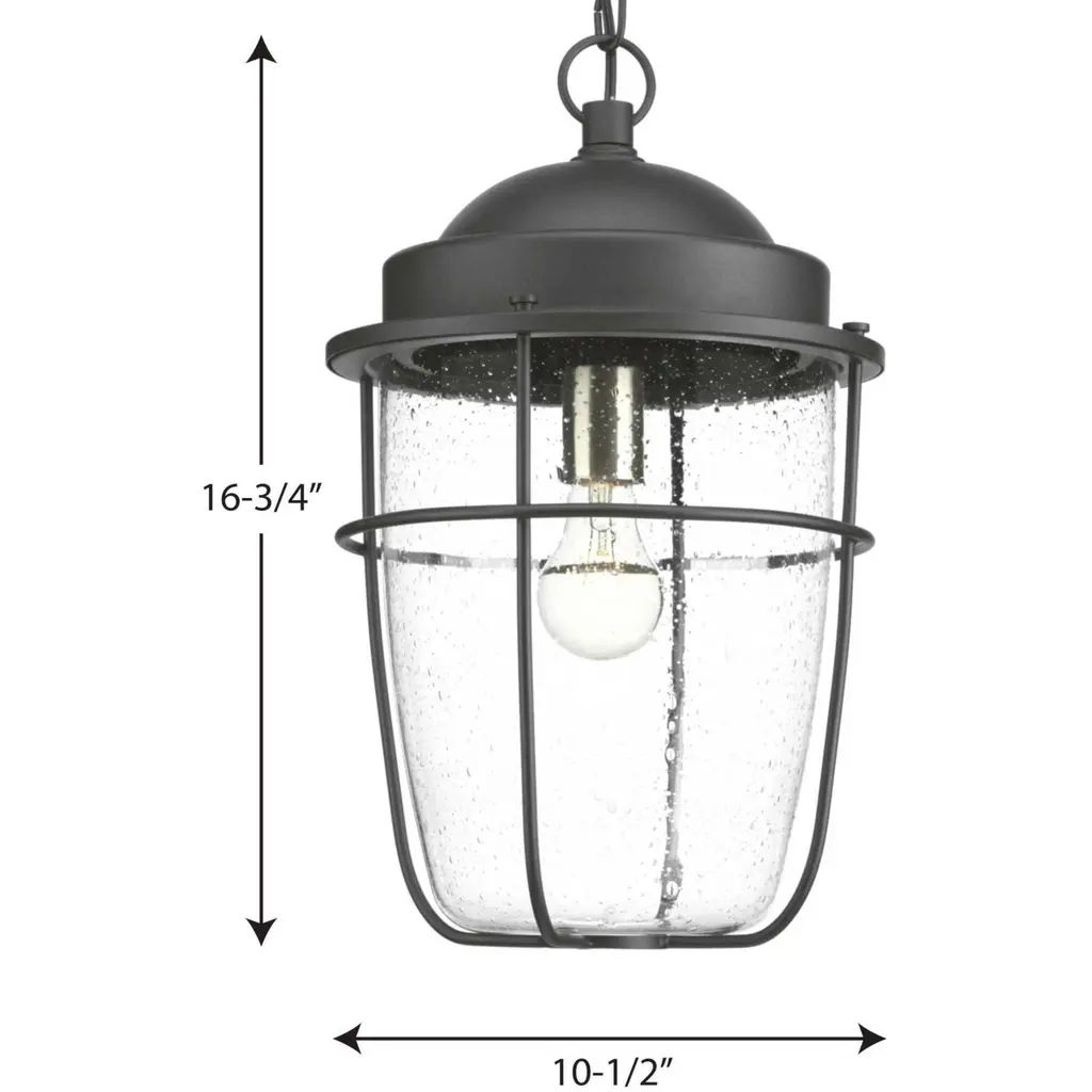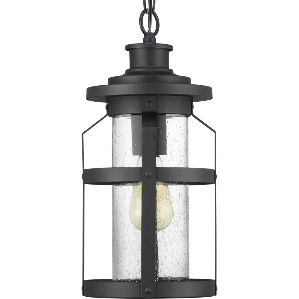 A nautical-inspired collection ideal for a variety of exteriors, including Coastal, Transitional and Urban Industrial settings. The one-light black hanging lantern with clear seeded glass feature a hint of brushed nickel on the interior. Geometric details offer a finishing touch for wall, hanging and post lantern options.