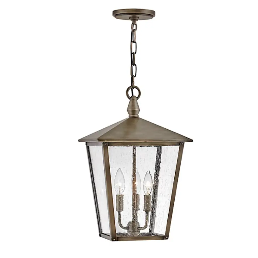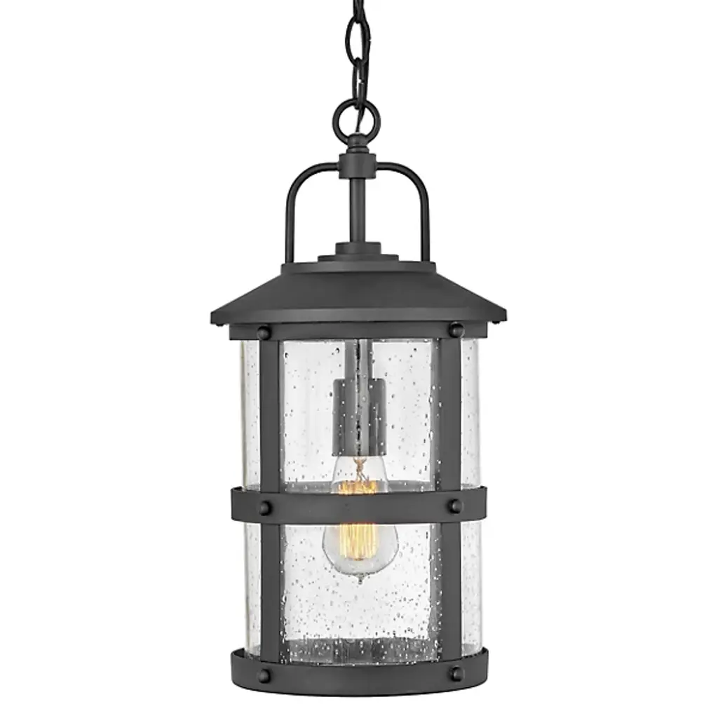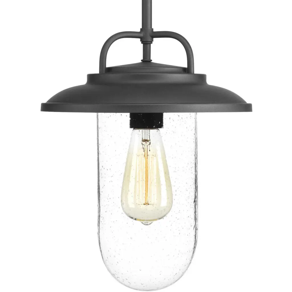 A nautical-inspired collection ideal for a variety of exteriors, including Coastal, Transitional and Urban Industrial settings. The one-light black hanging lantern with clear seeded glass feature a hint of brushed nickel on the interior. Geometric details offer a finishing touch for wall, hanging and post lantern options.