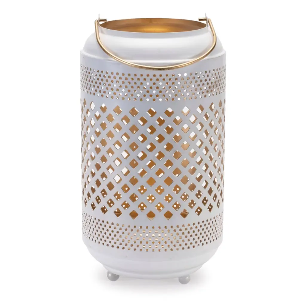 This 14-inch white and gold lattice metal centerpiece lantern candle holder adds flair, function, and visual interest to any home or special occasion. This candleholder with a pierced lattice design is the perfect illuminating design to accent your space in style. Candleholders are an attractive way to turn a simple candle into a piece of décor. 13.75-inch h x 5.75-inch w x 5.75-inch d.