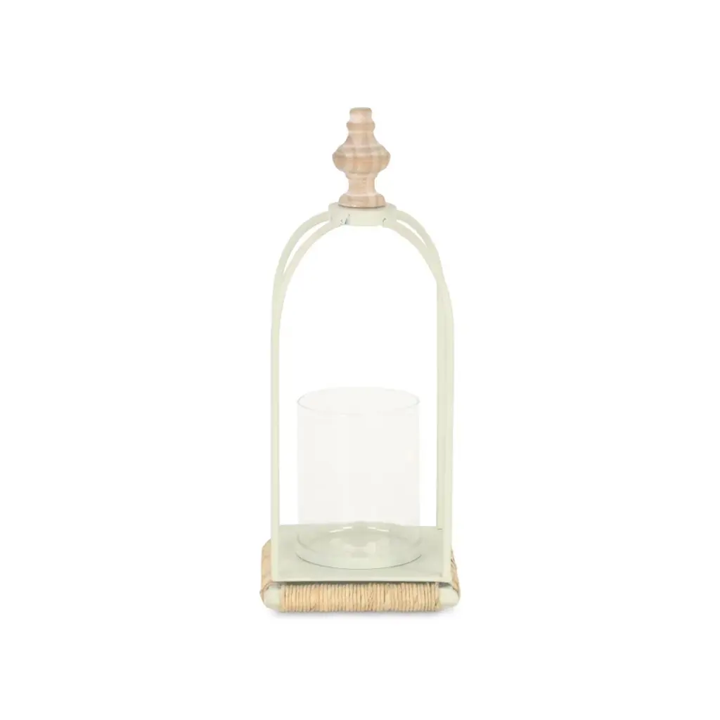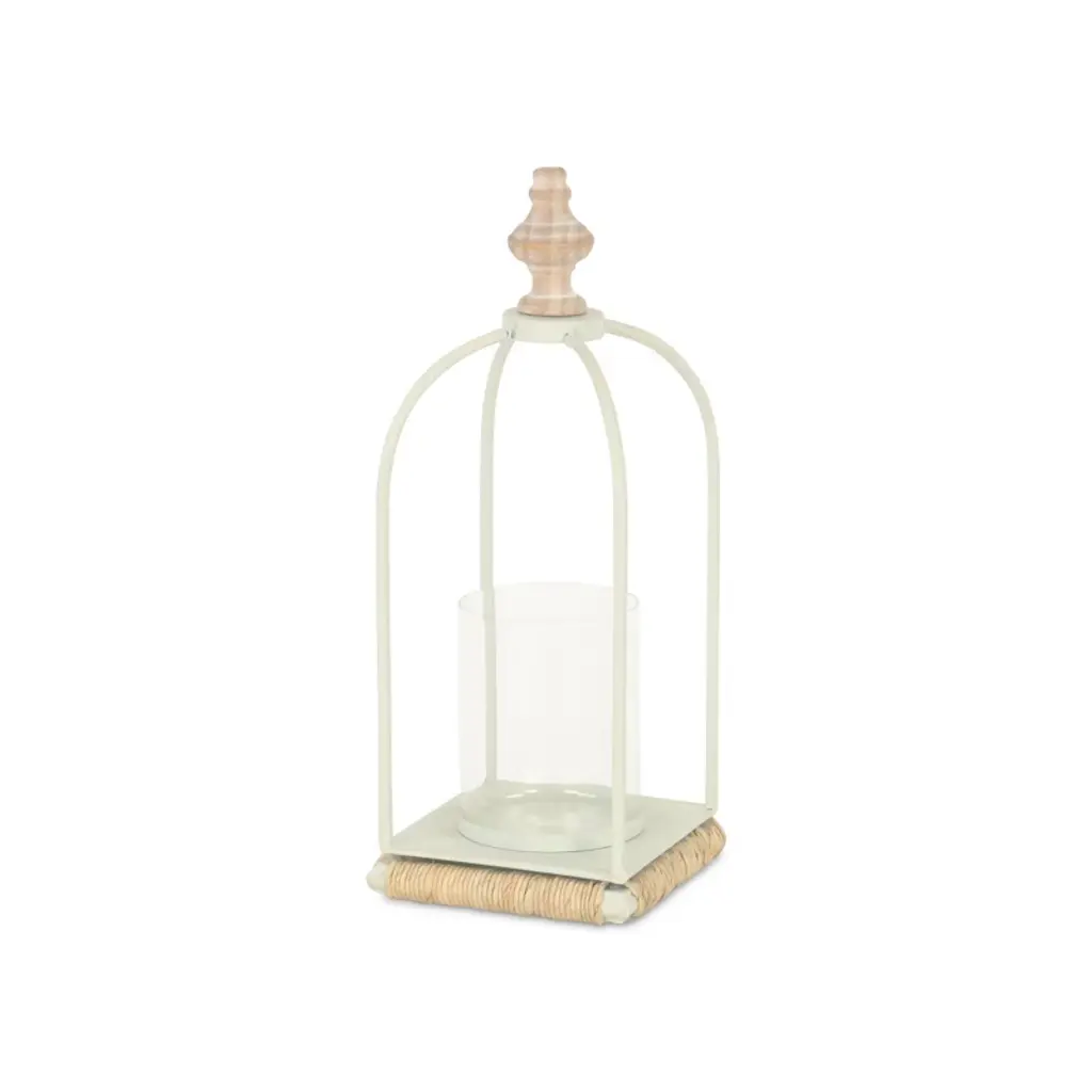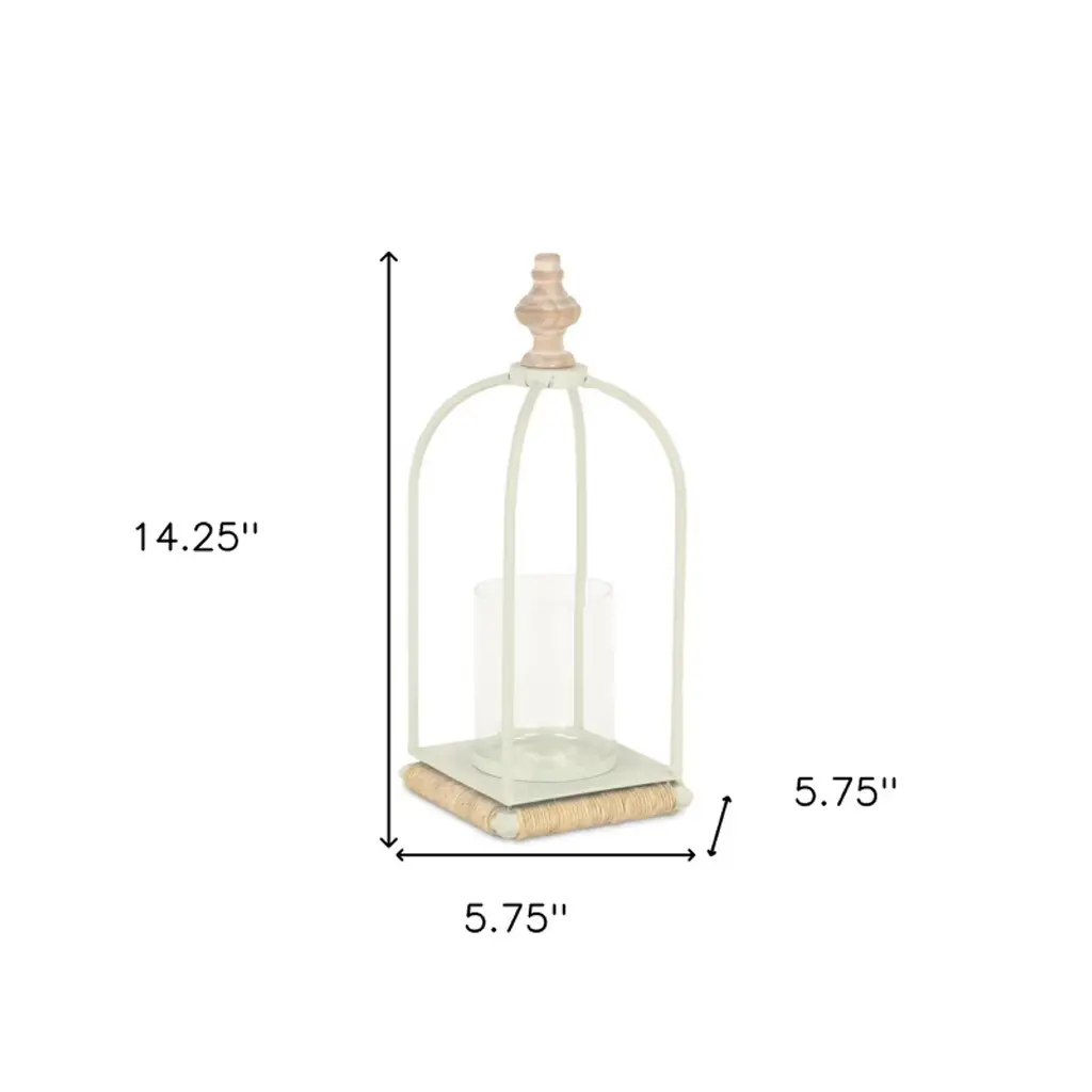Stylize your tabletop, light up your back patio or add the perfect touch of low light to your living room with this 14-inch white metal with wood and rope tabletop lantern candle holder. Handmade by skilled craftsmen and designed to add a glamorous glow to any event or table setting. This candleholder is the perfect illuminating design to accent your space in style. Candleholders are a decorative accent on their own. They are also an attractive way to turn a simple candle into a piece of décor on its own. 14.25-inch h x 5.75-inch w x 5.75-inch d.