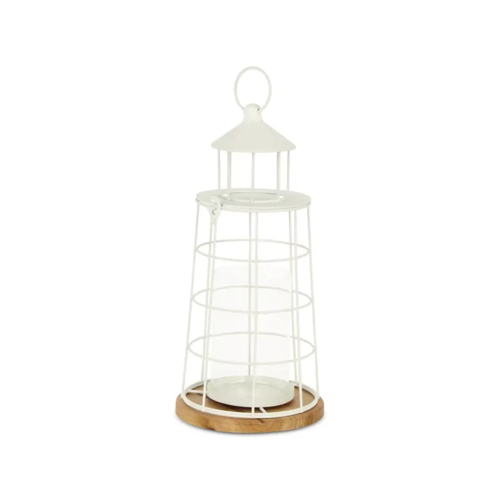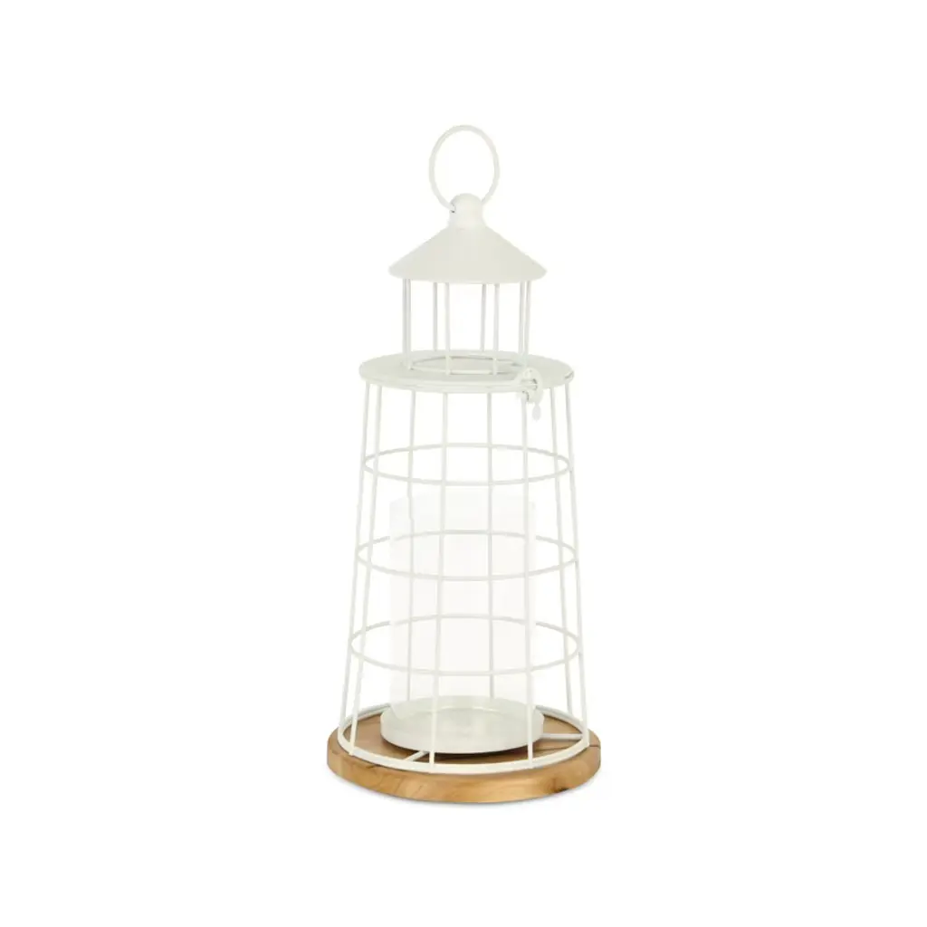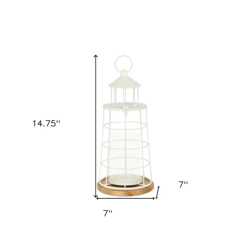 Homeroots 15" White And Natural Metal And Wood Lighthouse Tabletop Lantern Candle Holder
