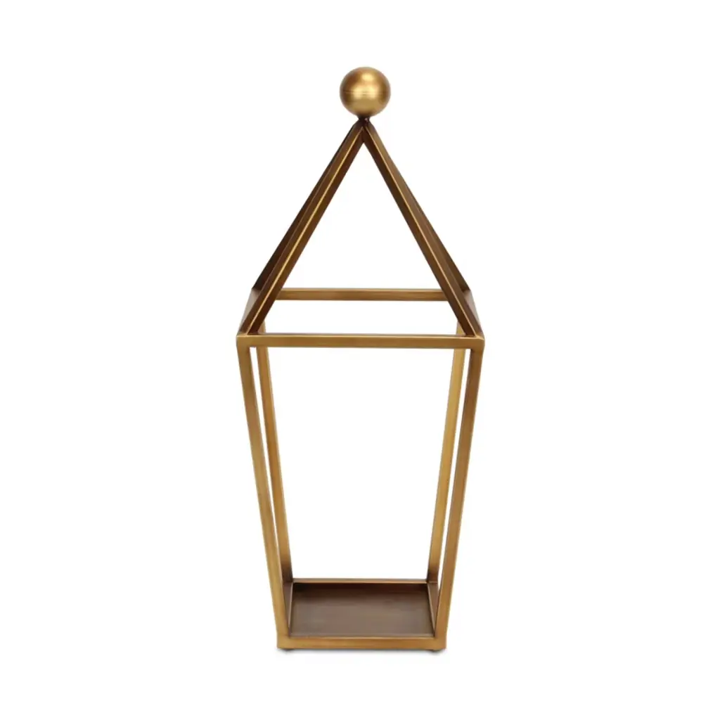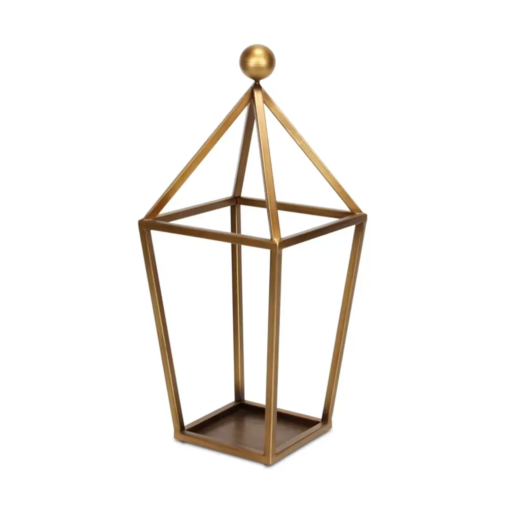 You can showcase this 24-inch gold geometric metal tabletop lantern candle holder on its own as alternative centerpieces or position it among flower arrangements on your tables. A perfect functional and decorative accent piece for weddings, dining tables and living rooms alike. Handmade by skilled craftsmen and designed to add a glamorous glow to any event or table setting. This candleholder is the perfect illuminating design to accent your space in style. Candleholders are a decorative accent on their own. With our without candles. 24.00-inch h x 10.00-inch w x 10.00-inch d.