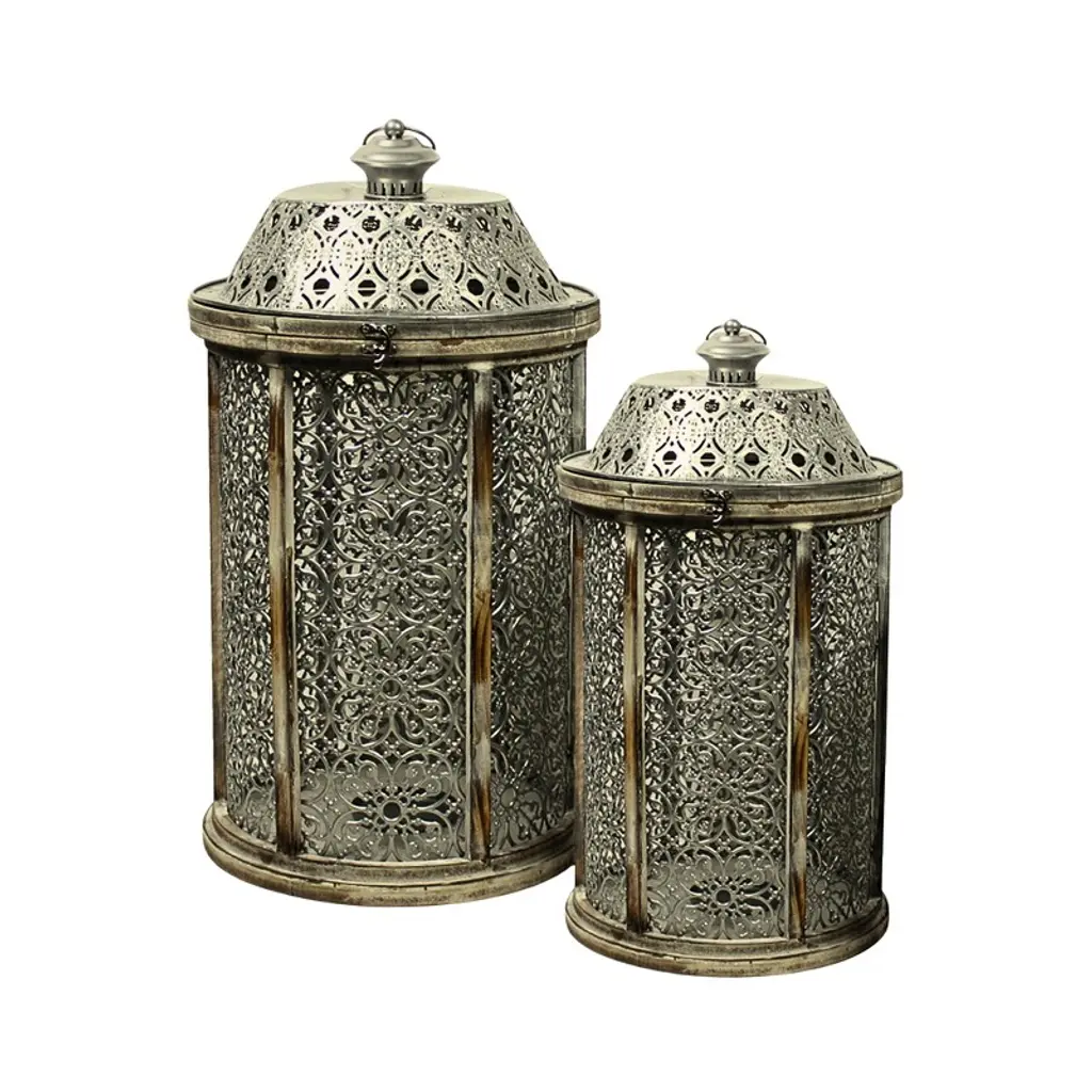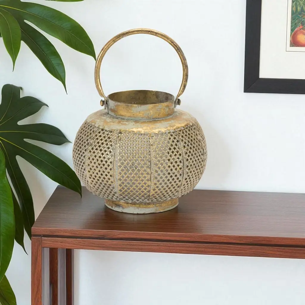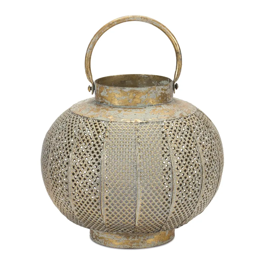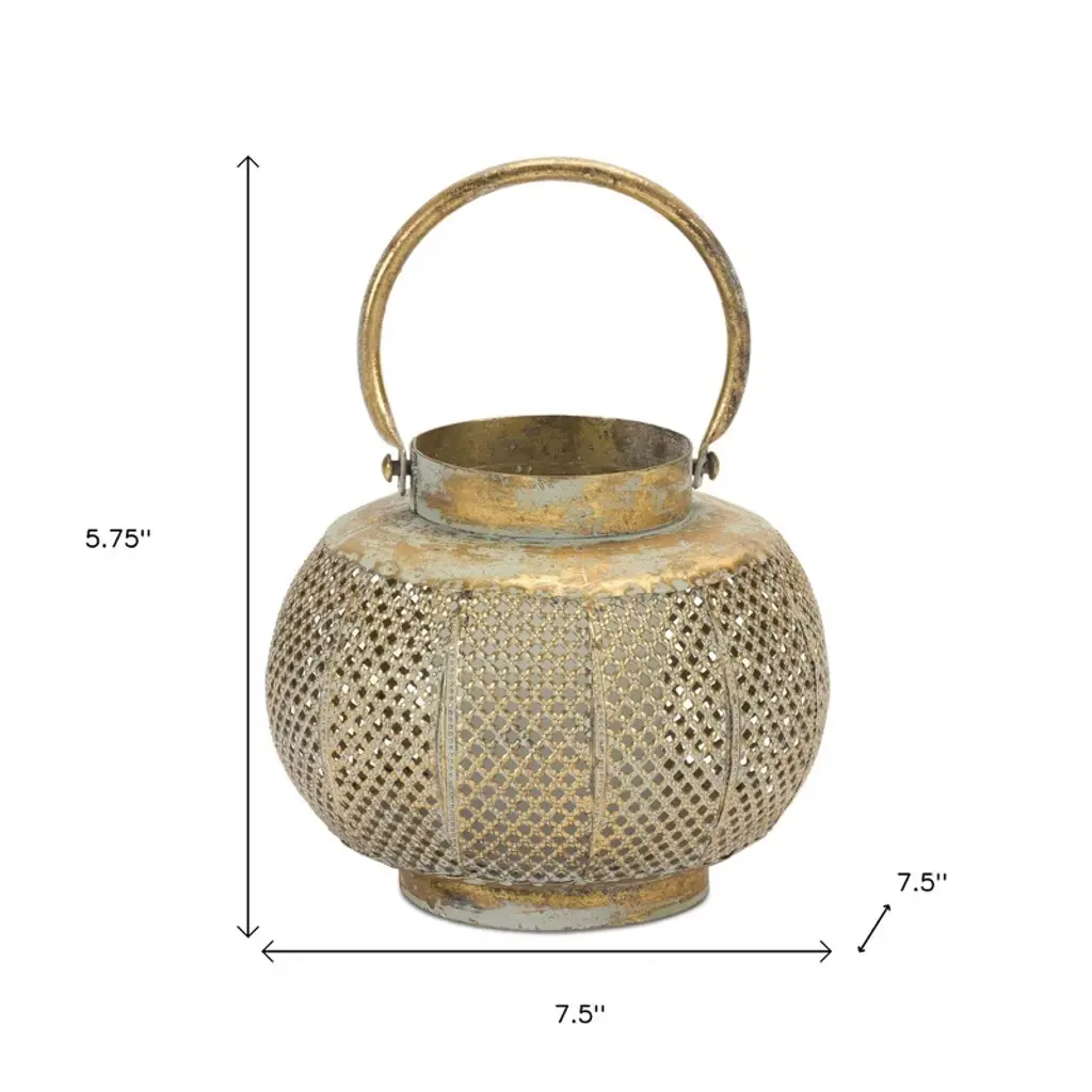 This 6-inch bronze and green distressed lattice metal tabletop lantern candle holder adds flair, function, and visual interest to any home or special occasion. Dress up your home to impress every season with this fabulous candleholder that features a pierced design in a warm golden bronze color with a rustic green patina. This rustic candleholder is a decorative accent onto its own, with or without candles. 5.75-inch h x 7.50-inch w x 7.50-inch d.
