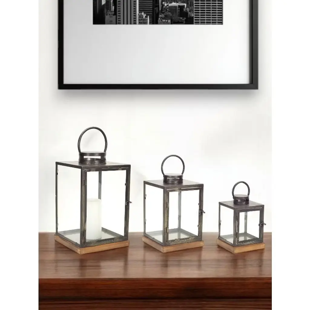 Homeroots Set Of Three Gray And Brown Distressed Geometric Glass Metal And Wood Floor Lantern Candle Holders