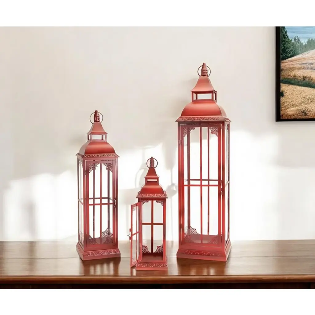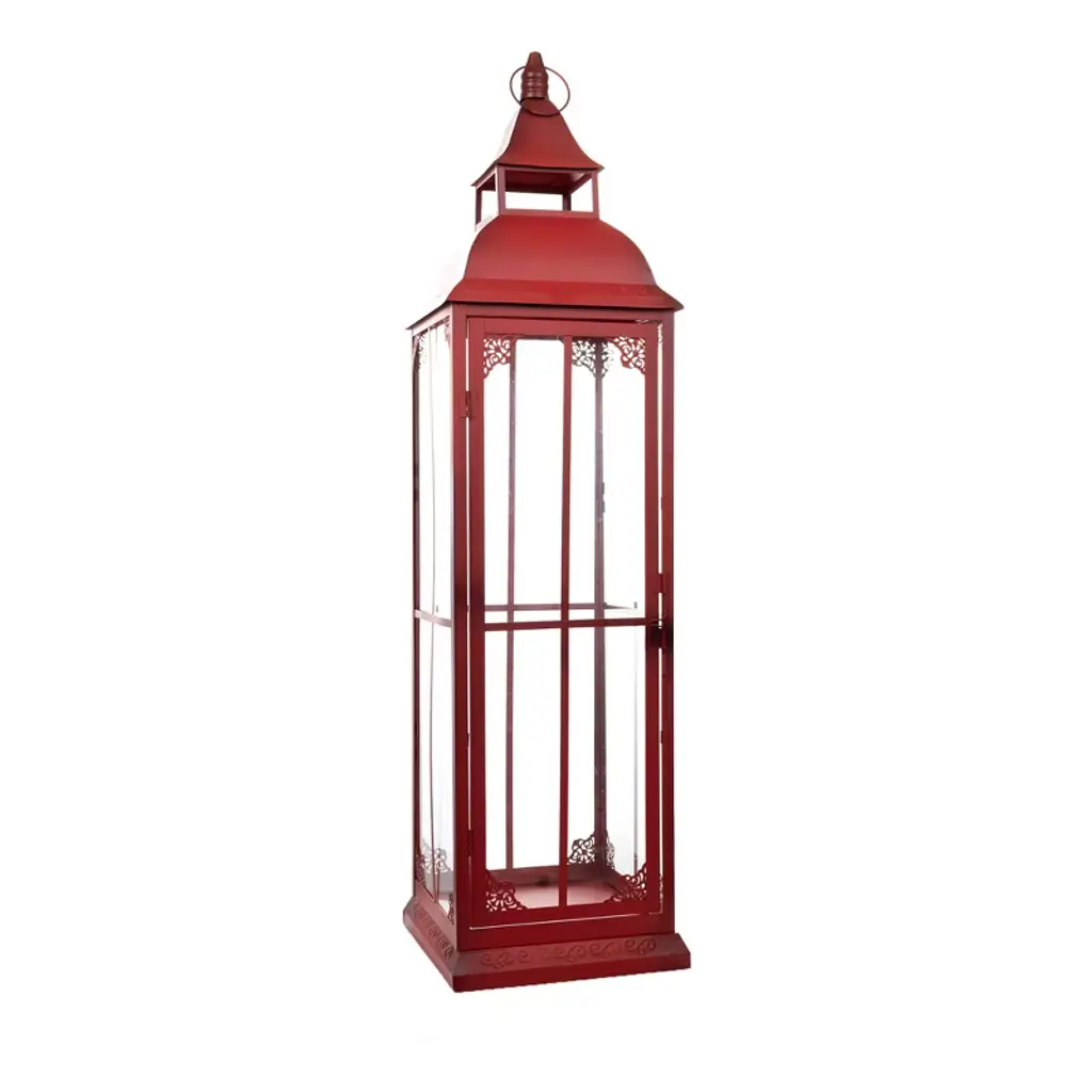 You can showcase this set of three red distressed ornate glass and metal floor lantern candle holders on its own as alternative centerpieces or position it among flower arrangements on your tables. A perfect functional and decorative accent piece for weddings, dining tables and living rooms alike. This candleholder is the perfect illuminating design to accent your space in style. Candleholders are an attractive way to turn a simple candle into a piece of décor. 37-inch h x 9.5-inch w x 9.5-inch d.