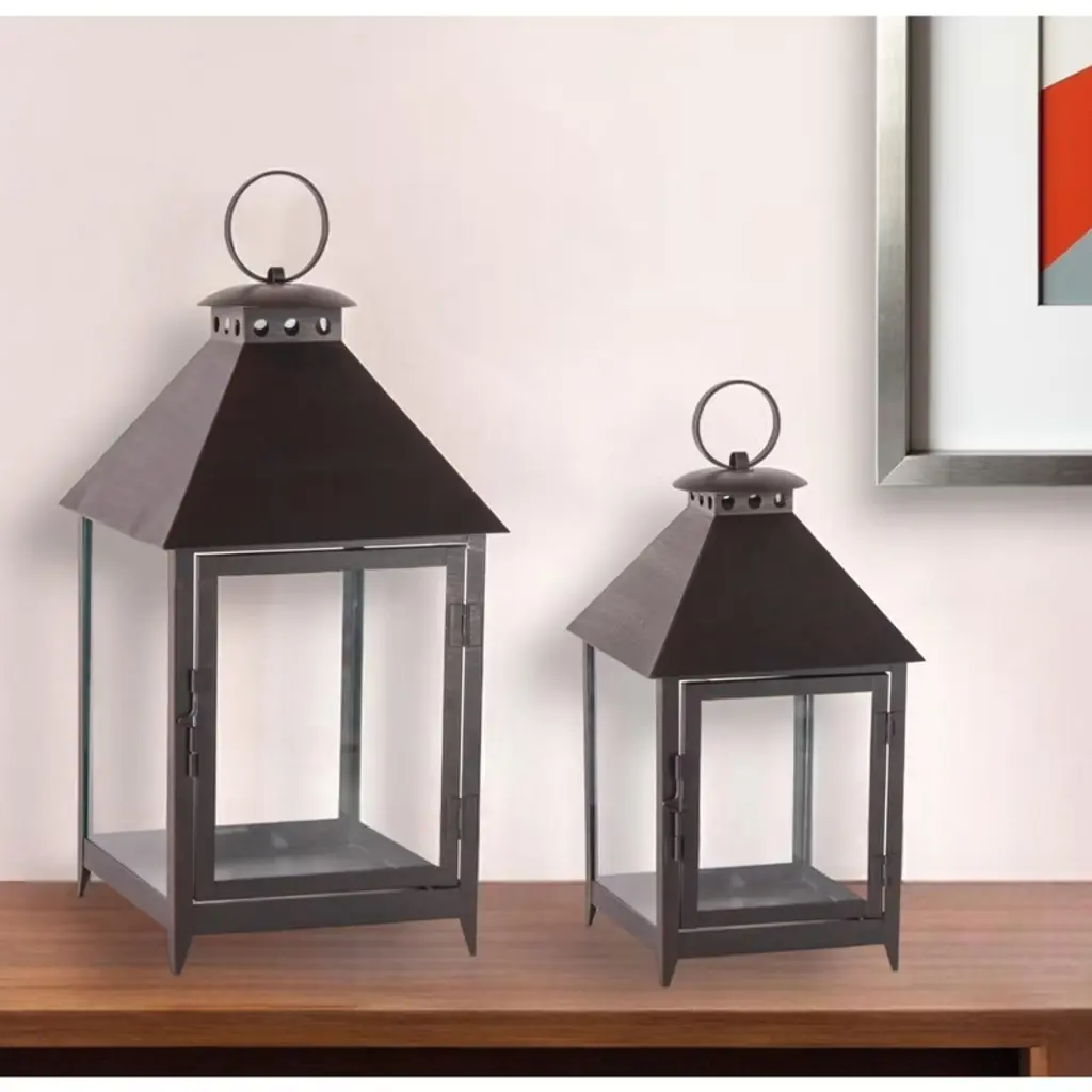 Homeroots Set Of Two Black Geometric Iron And Glass Floor Lantern Candle Holders