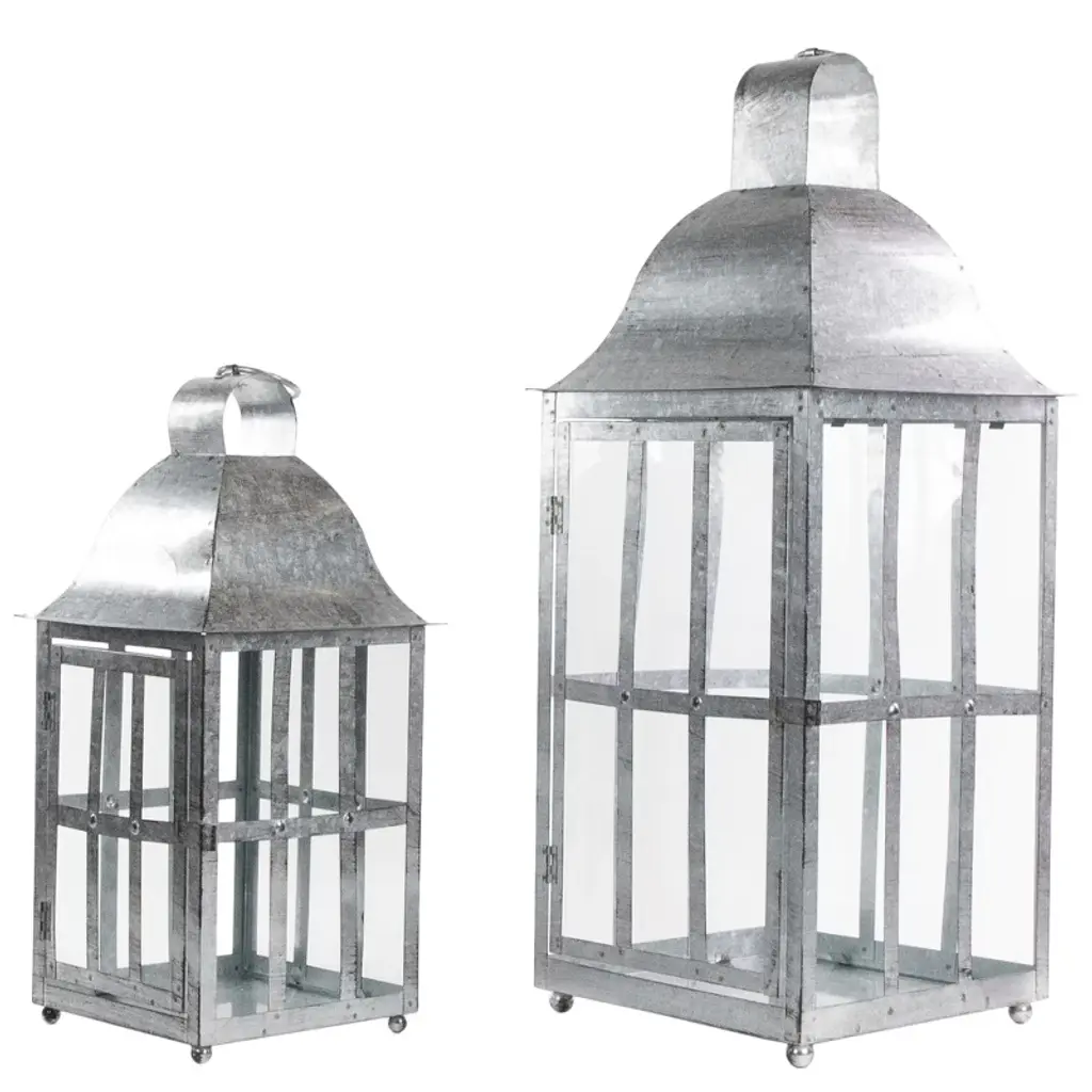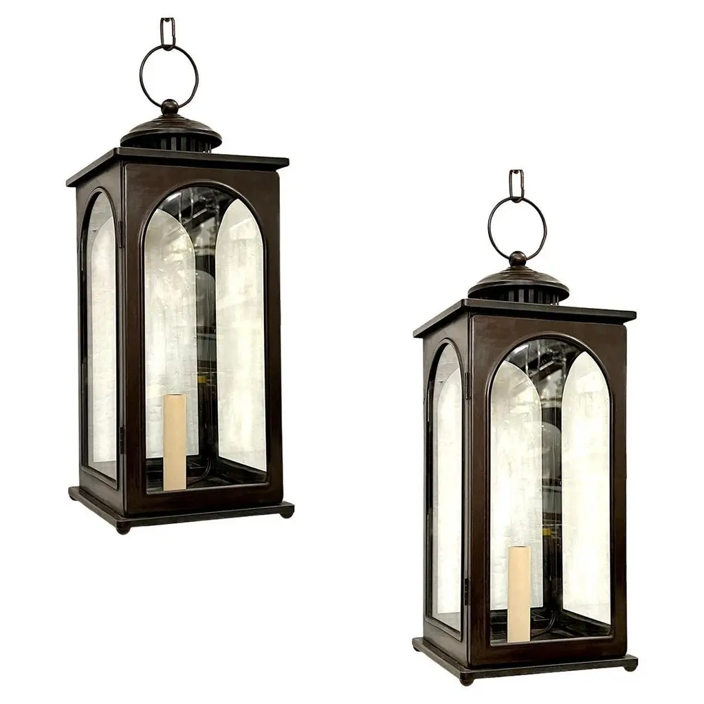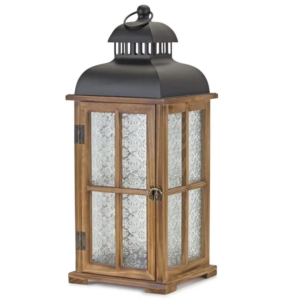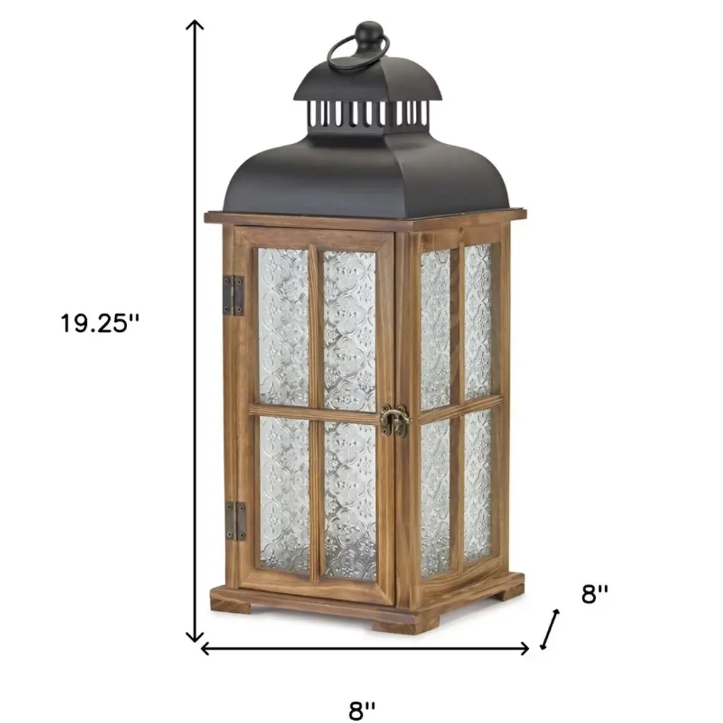 This set of two brown and black frosted glass wood and metal floor lantern candle holders adds flair, function, and visual interest to any home or special occasion. This candleholder set features frosted and decorated glass that creates the perfect illuminating design to accent your space in style. Lanterns are a decorative accent on their own - with or without candles. 19.25-inch H x 8-inch W x 8-inch D