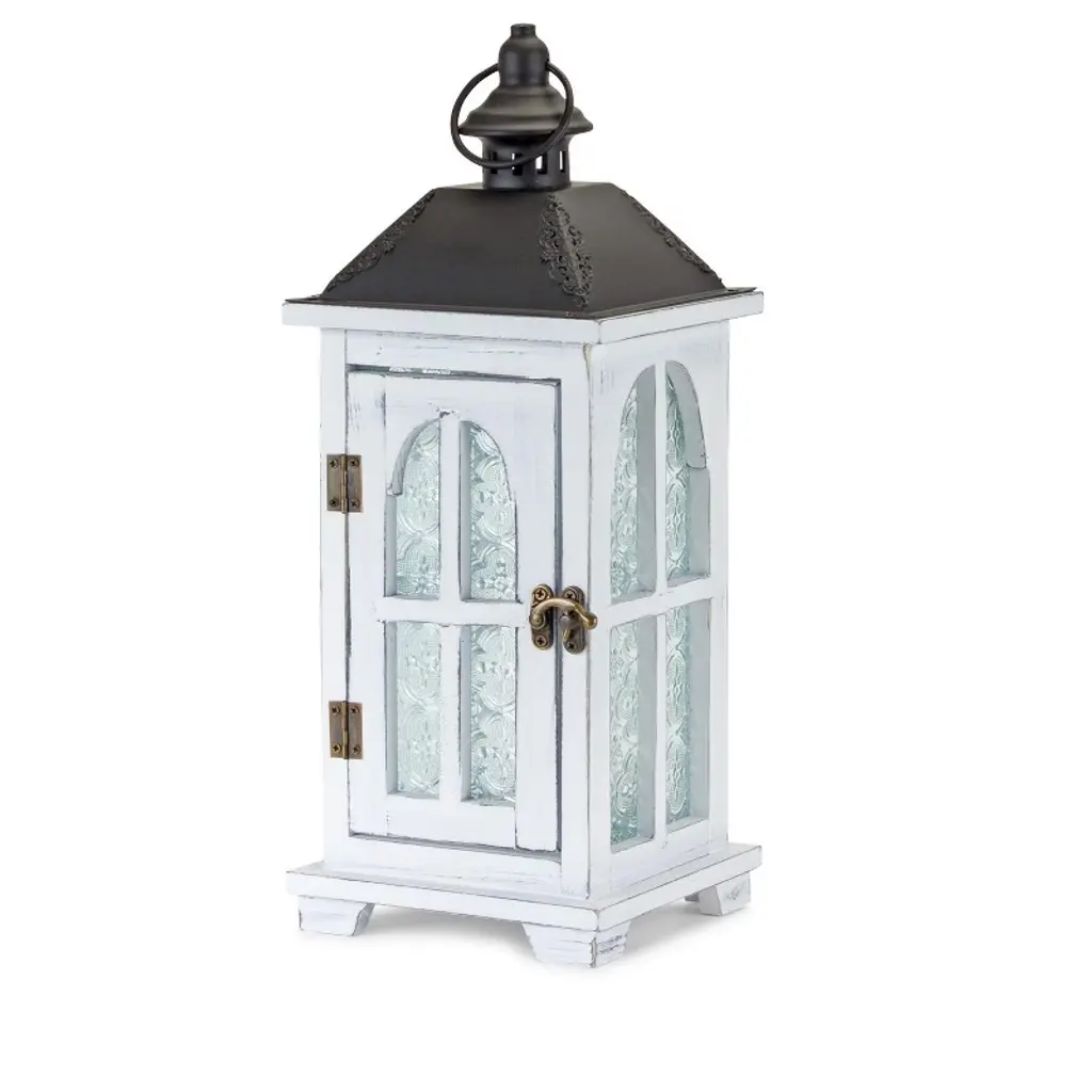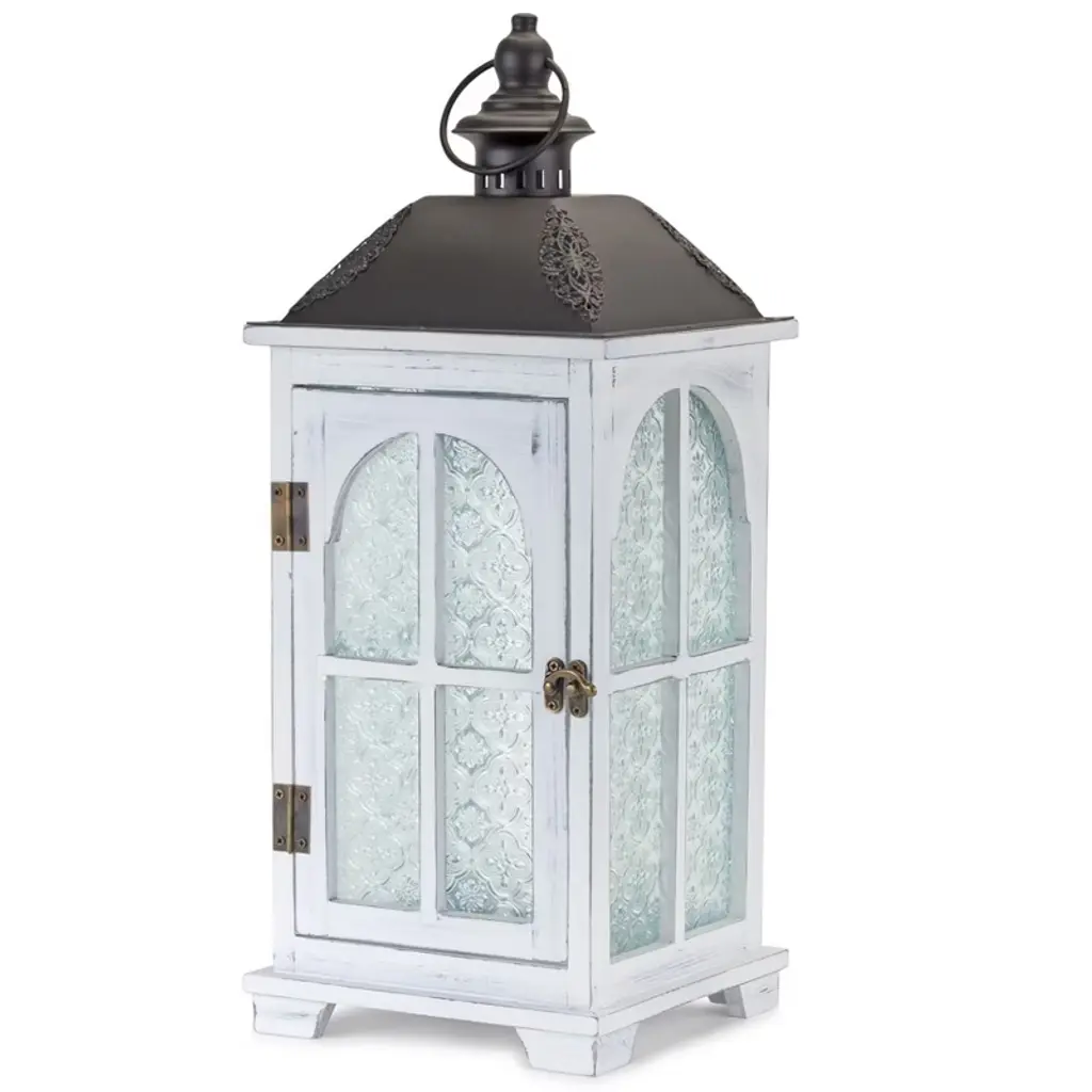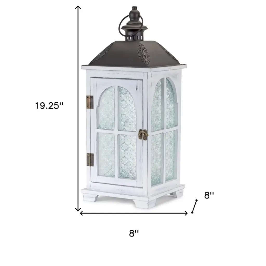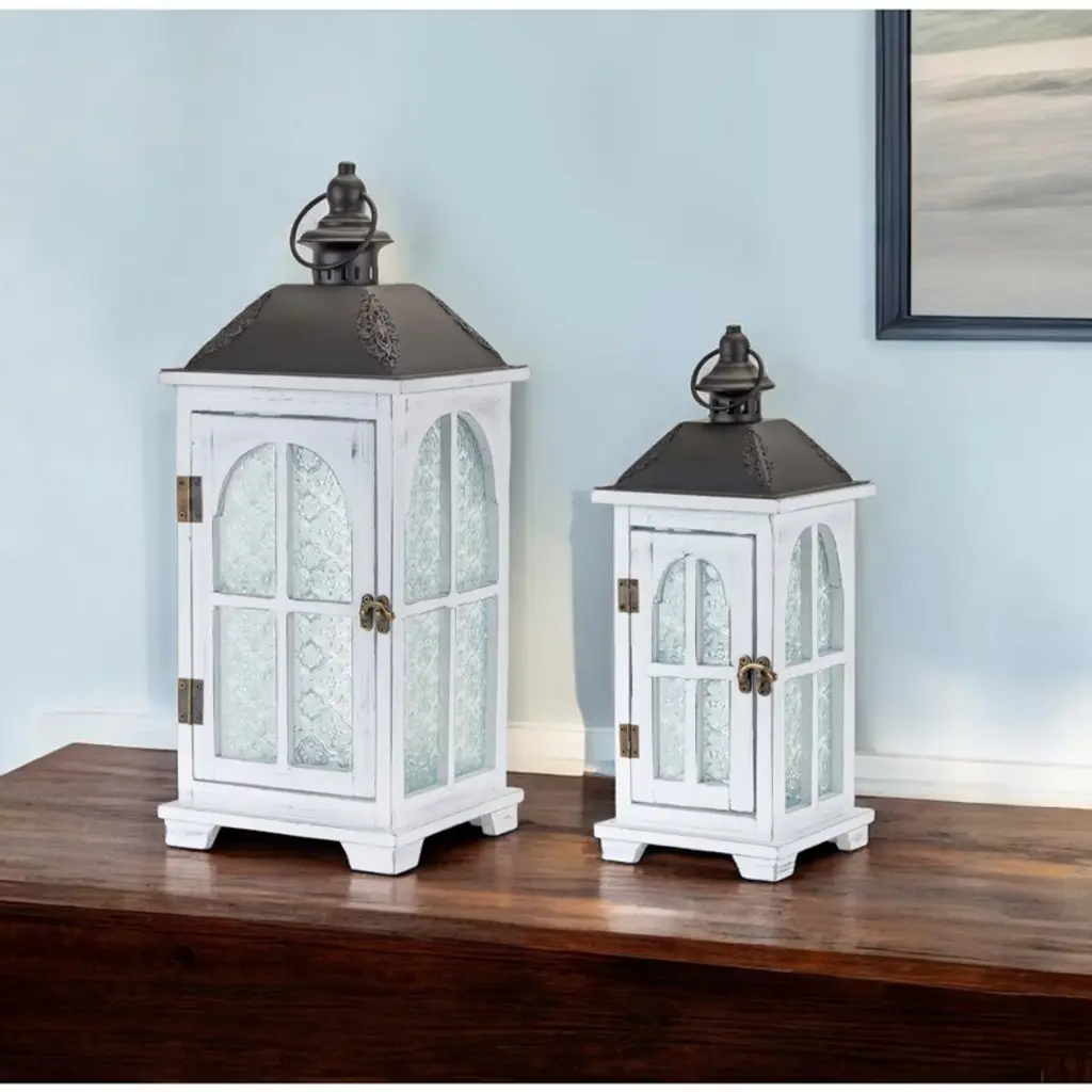 You can showcase this set of two white and black distressed ornate glass wood and metal floor lantern candle holders on its own as alternative centerpieces or position it among flower arrangements on your tables. A perfect functional and decorative accent piece for weddings, dining tables and living rooms alike. This candleholder is the perfect illuminating design to accent your space in style. Candleholders are an attractive way to turn a simple candle into a piece of décor. 19.25-inch h x 8-inch w x 8-inch d.