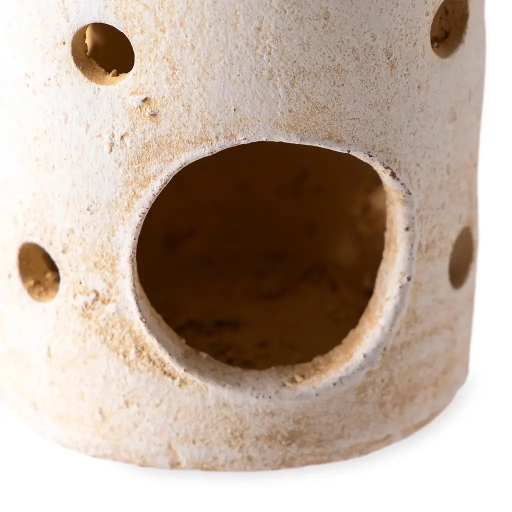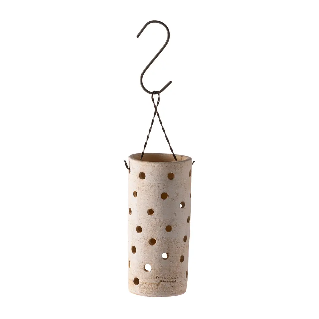 Illuminate your space with the ethereal glow of our Handcrafted Clay Hanging Candle Lantern. Made in Honduras, this piece radiates serene and rustic charm with its whitewashed finish. Standing at 12 inches tall, it makes a striking statement whether showcased alone or in a group, creating a captivating firefly effect against a dark wall. Hanging securely from twisted wire, this lantern is designed for stability and ease of display. Its body features a pattern of polka-dotted holes, thoughtfully arranged to let the candlelight filter through, casting warm, inviting patterns of light that enhance any setting. Ideal for adding ambiance to outdoor evenings or soft, ambient lighting indoors, this Clay Hanging Candle Lantern is more than just a light source. It’s a piece of art that brings character and warmth to any home, effortlessly blending with both modern and traditional decor.
