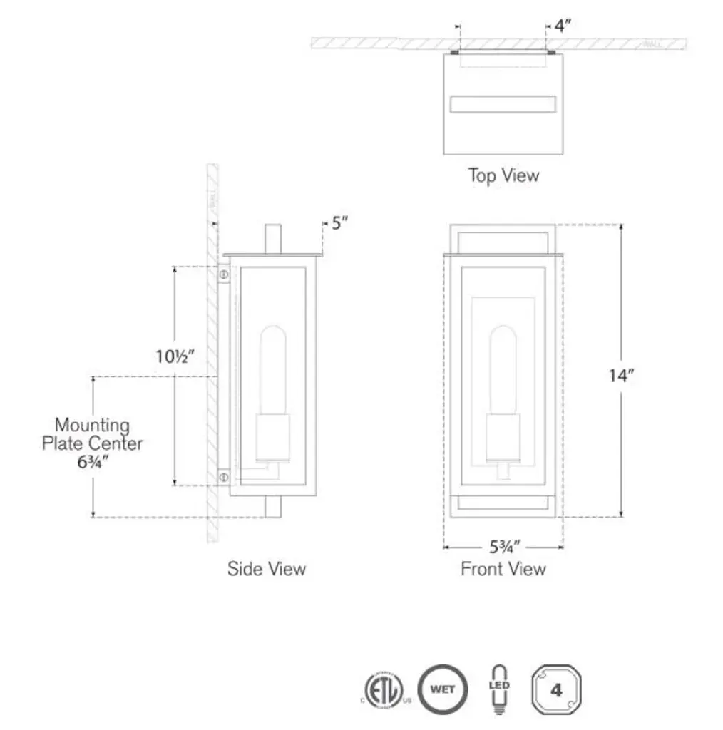 Halle Small Narrow Wall Lantern in Aged Iron with Clear Glass Designer: Ian K. Fowler Height: 14" Extension: 5" Backplate: 4.25" x 10.5" Rectangle Mounting: Hardwire Socket: E26 Keyless Wattage: 8 LED T10 Safety Rating Location: WET Note: UL Only