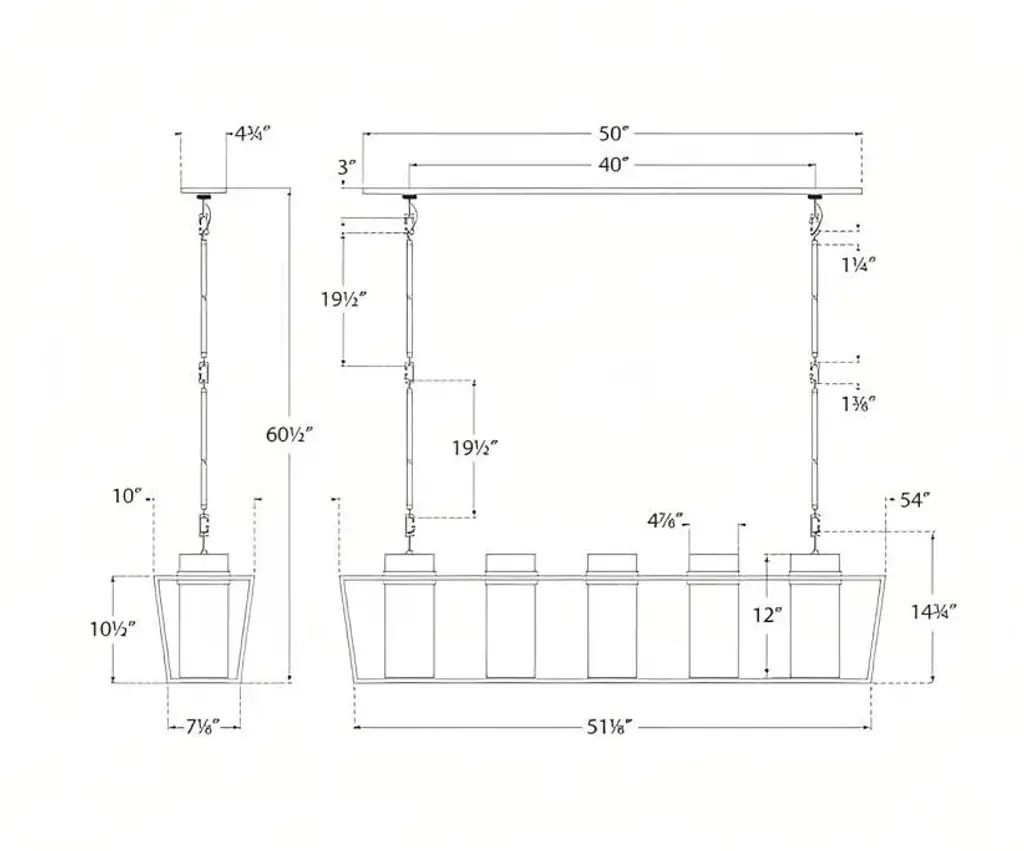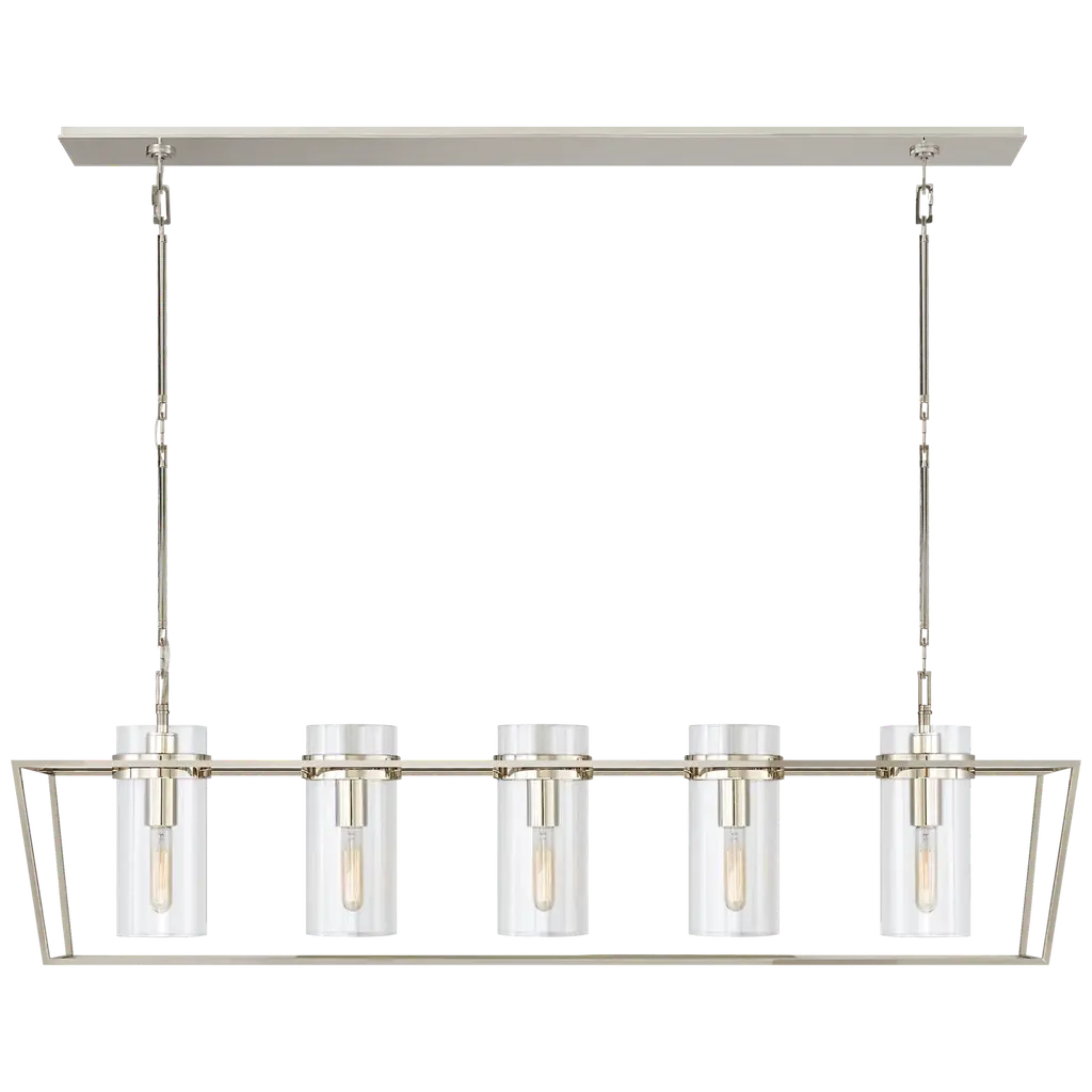 Presidio Large Linear Lantern in Polished Nickel with Clear Glass Designer: Ian K. Fowler Fixture Height: 15.5" Min. Custom Height: 24" O/A Height: 61" Canopy: 4.75" x 50" Rectangle Mounting: Rod Shade Detail: Clear Glass Socket: 5 - E26 Keyless Wattage: 5 - 60 T10 Safety Rating Location: Damp