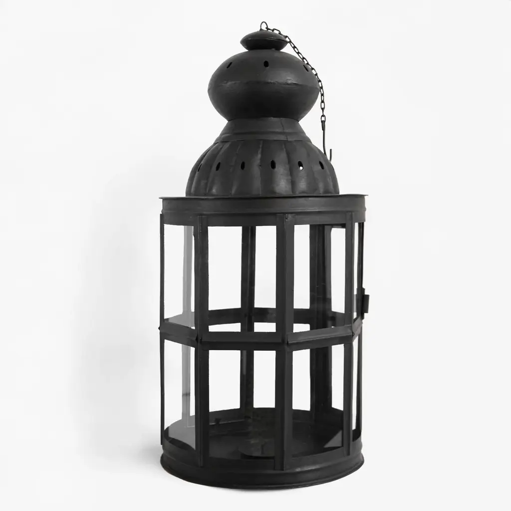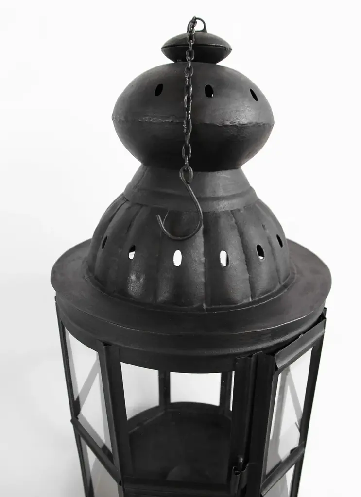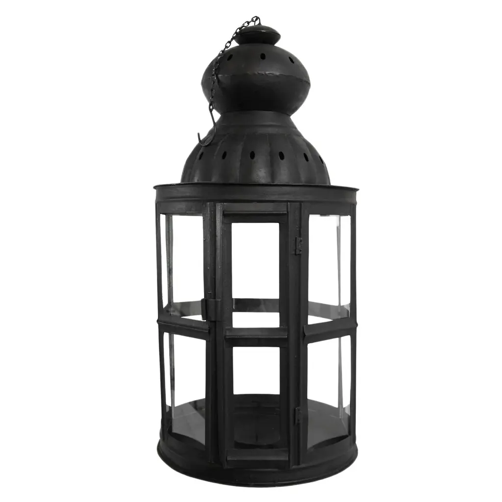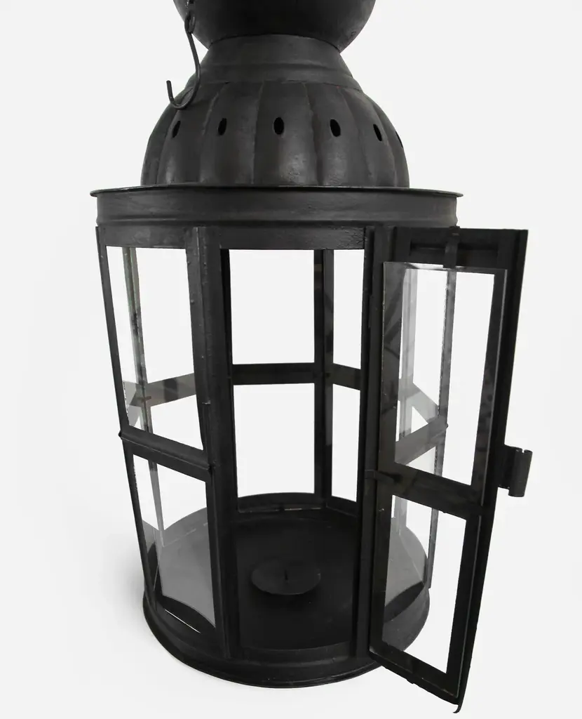 Handmade black matte iron lantern with glass window panels and door that opens to place candles. Comes with hanging chain and hook.