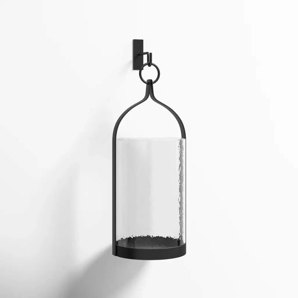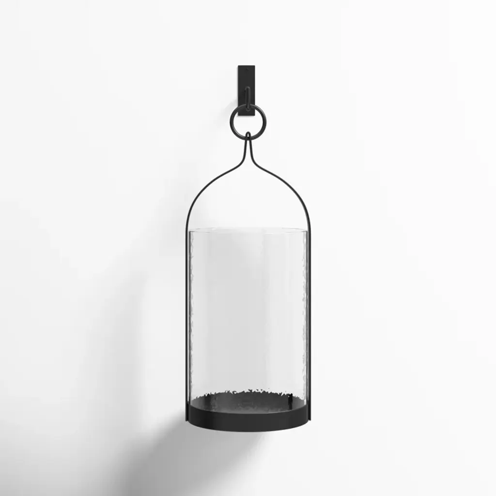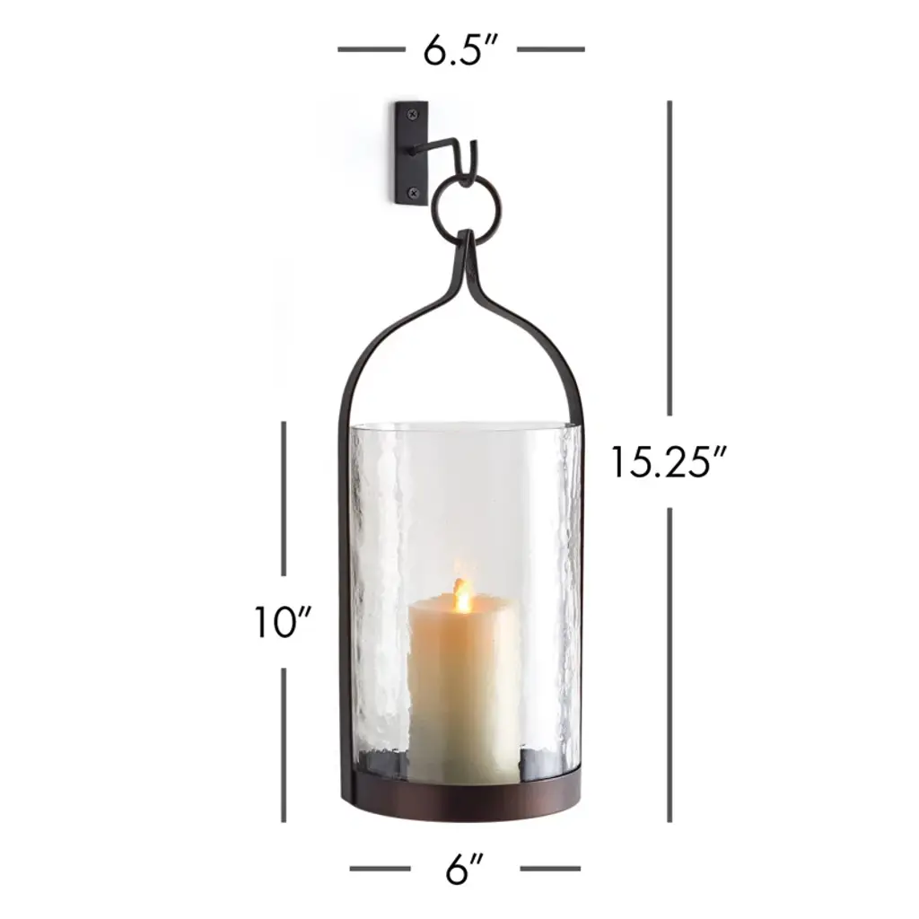 This wall-mounted lantern candle holder completes your coastal farmhouse space with a vintage-inspired charm. Its frame and backplate are crafted from iron in a dark bronze-black finish, with a hook that supports a cylindrical shape. The shade features a classic hurricane shade with warped glass for a dreamy, wavy look. This candle holder has room for one 4'' wide pillar traditional or LED candle (sold separately). If using an LED, find one with a flicking flame effect to complete the rural look.