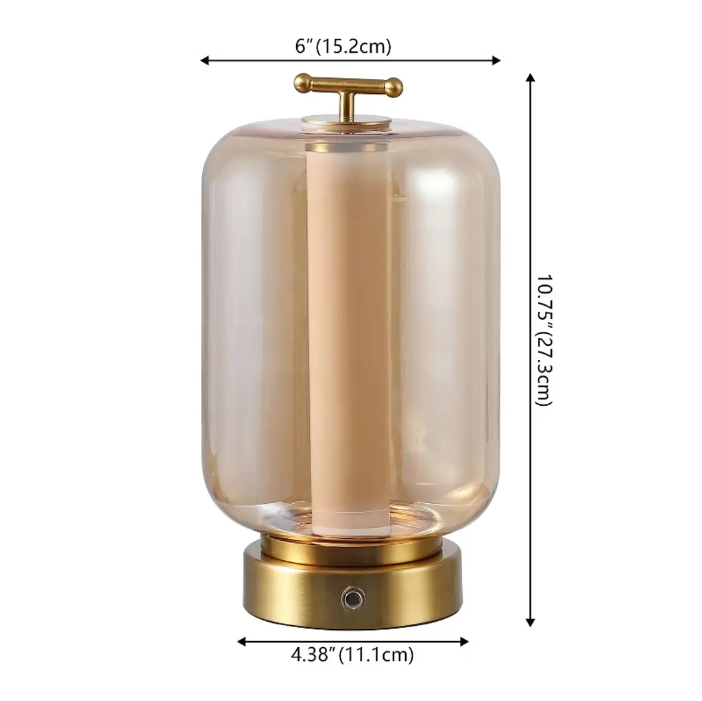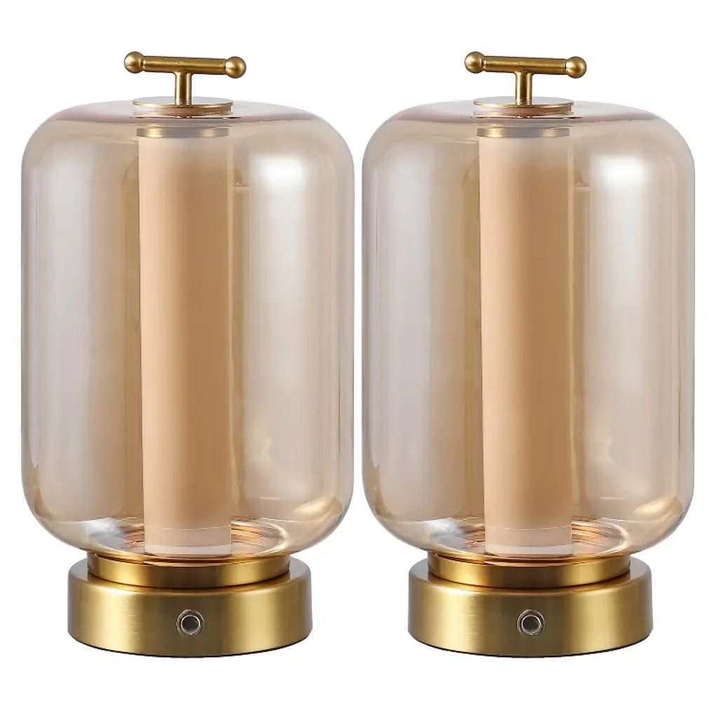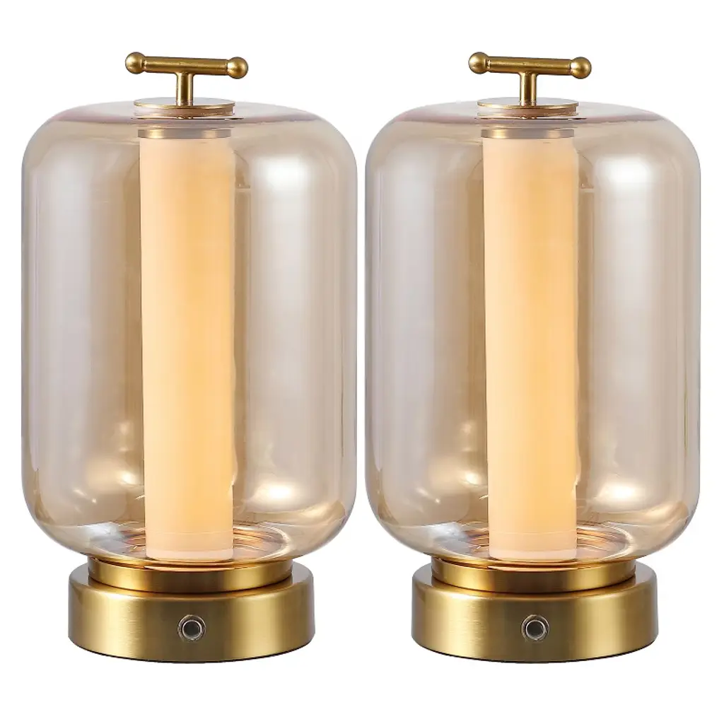 This glam pair of modern lanterns adds a warm glow to the bedroom, living room or office. It features a glass cylinder shade with sparkling metal fittings, a frosted diffuser insert and a bright LED bulb controlled by a touch sensor. Use this set of two cordless lanterns almost anywhere with the rechargeable battery.