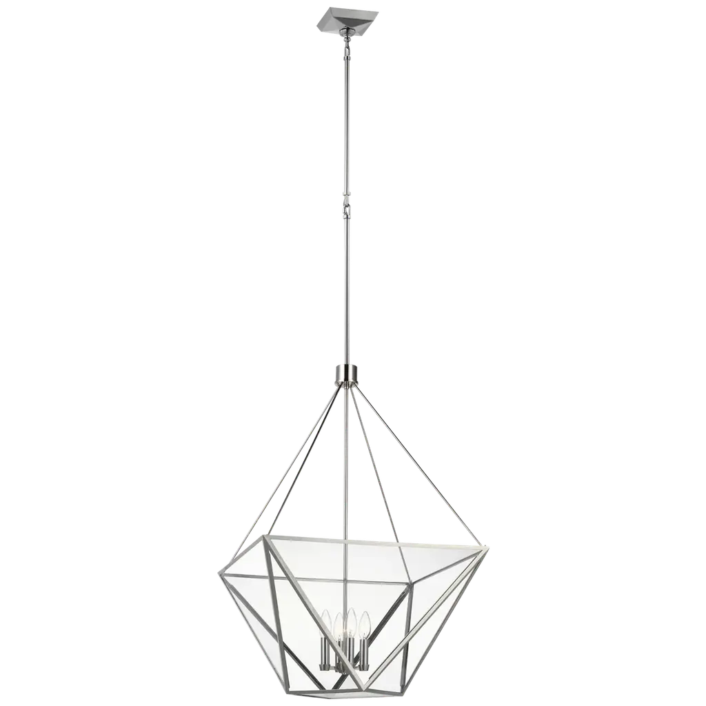 Lorino Large Lantern in Polished Nickel with Clear Glass Designer: Julie Neill Fixture Height: 34" Min. Custom Height: 55" O/A Height: 70.75" Canopy: 5.5" Square Mounting: Rod Shade Detail: Clear Glass Socket: 4 - E12 Candelabra Wattage: 4 - 6.5 LED B11 Safety Rating Location: DAMP Note: Custom Height Available