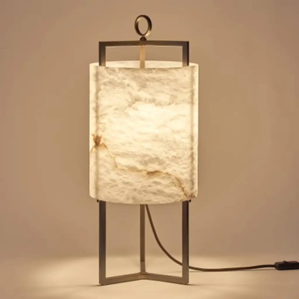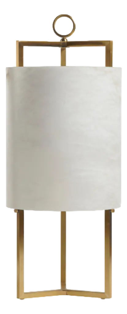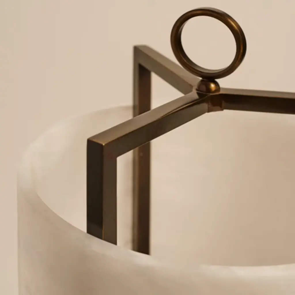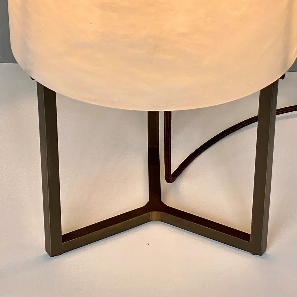 The alabaster Lantern is a table lamp that can easily placed on the floor. It combines the ethereal allure of the alabaster, evidencing its veining, in contrast with the dark warm effect of the bronze finish. This lamp is composed of a tripodal brass structure with light bronze finish, hosting an E27 lightbulb holder. The top ring enables to easily move the lamp according to its functions.