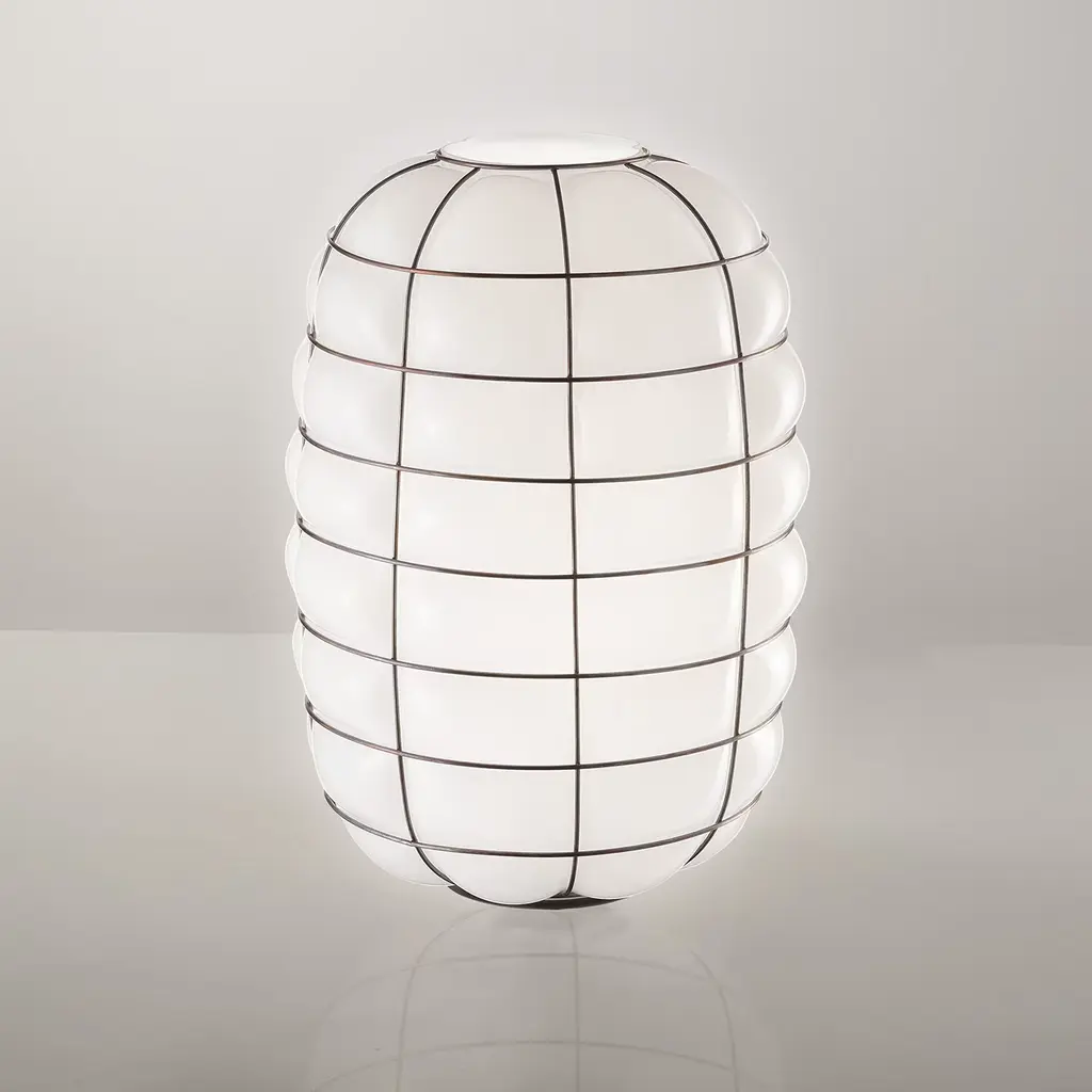 A modern take on traditional lanterns, this exquisite table lamp flaunts a clean design incorporating vaporous cloud in white Murano glass within a minimalist stainless steel cage. Mouthblown by skilled glassmakers with minute attention to detail, the shade appears softly swelling up through the cage's sections, allowing the observer to admire the transformative nature of glass masterfully shaped by expert artisans. Due to handcrafting, slight changes in metal's finish may occur.