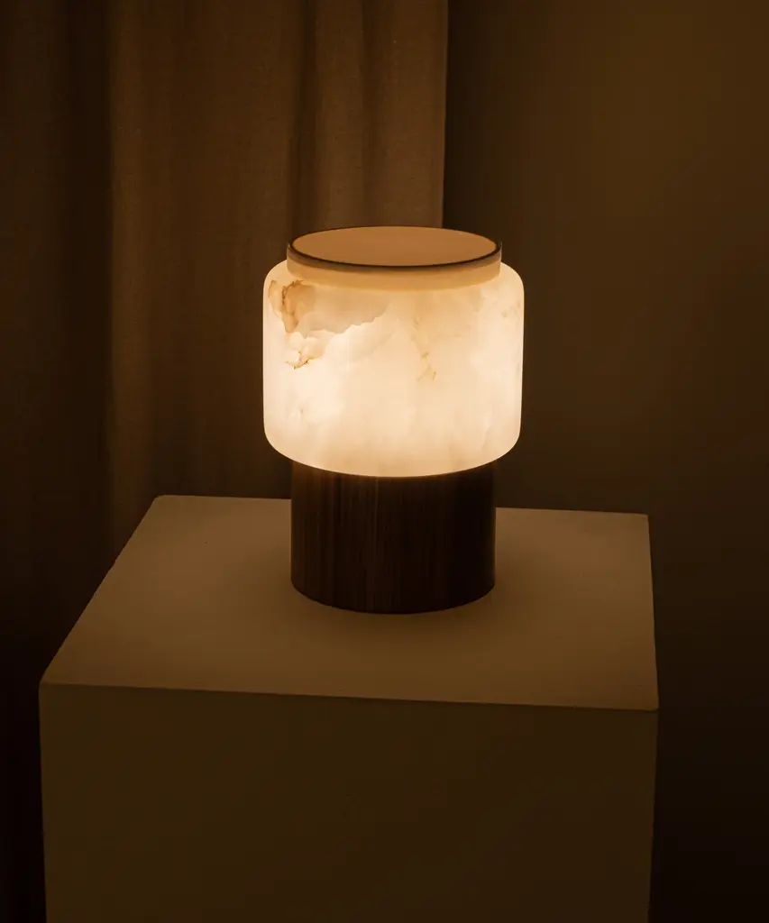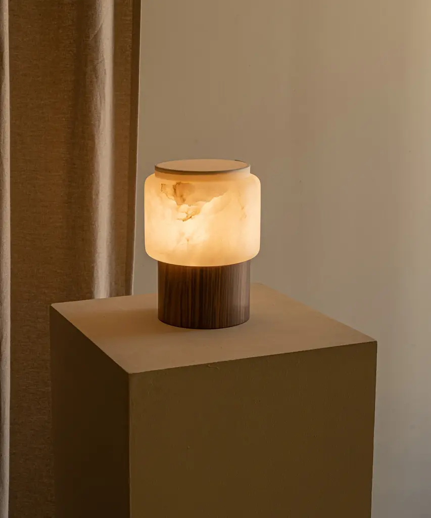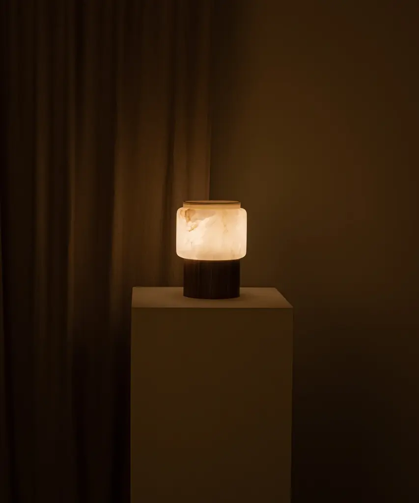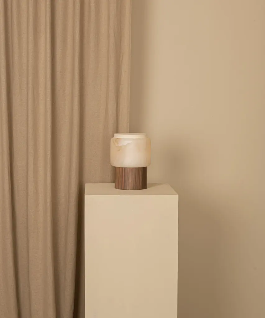 A modern and revisited version of the authentic Asian lantern, Lanterno is a wireless table lamp where the association of cotton and alabaster creates a beautiful and poetic light, nested in a solid wooden base. Each Simone & Marcel lighting fixture is hand-made to order in the designers' studio located in rural Spain. Every product uses only materials and components sourced from local suppliers, all within a short drive of their workshop - an abandoned agricultural warehouse that the couple renovated themselves.