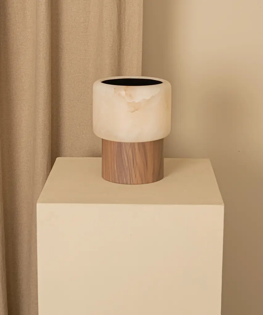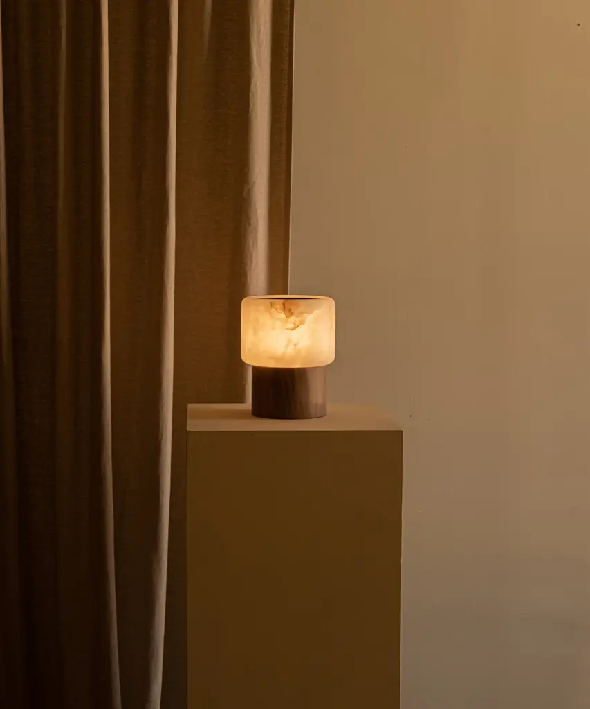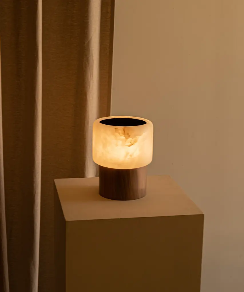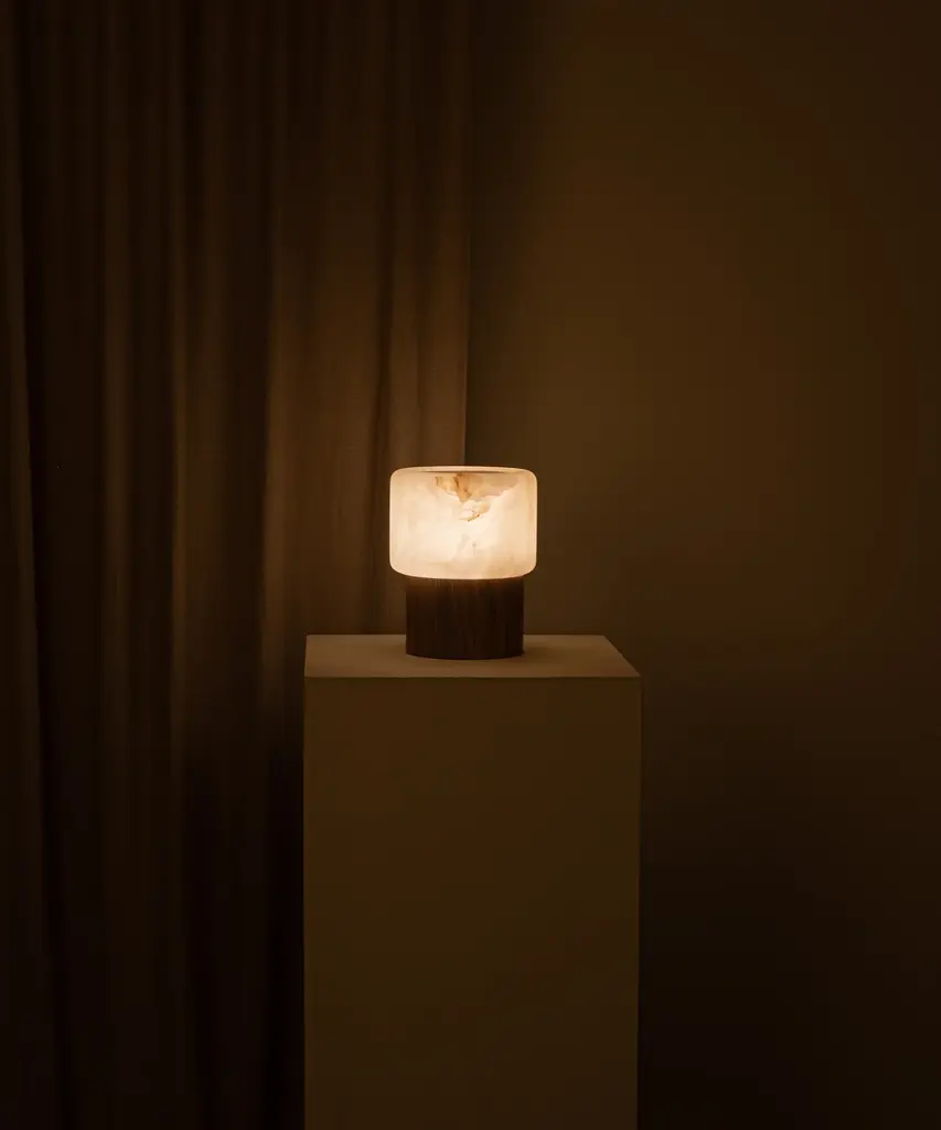 A modern and revisited version of the authentic Asian lantern, Lanterno is a wireless table lamp where the association of cotton and alabaster creates a beautiful and poetic light, nested in a solid wooden base. Each Simone & Marcel lighting fixture is hand-made to order in the designers' studio located in rural Spain. Every product uses only materials and components sourced from local suppliers, all within a short drive of their workshop - an abandoned agricultural warehouse that the couple renovated themselves.