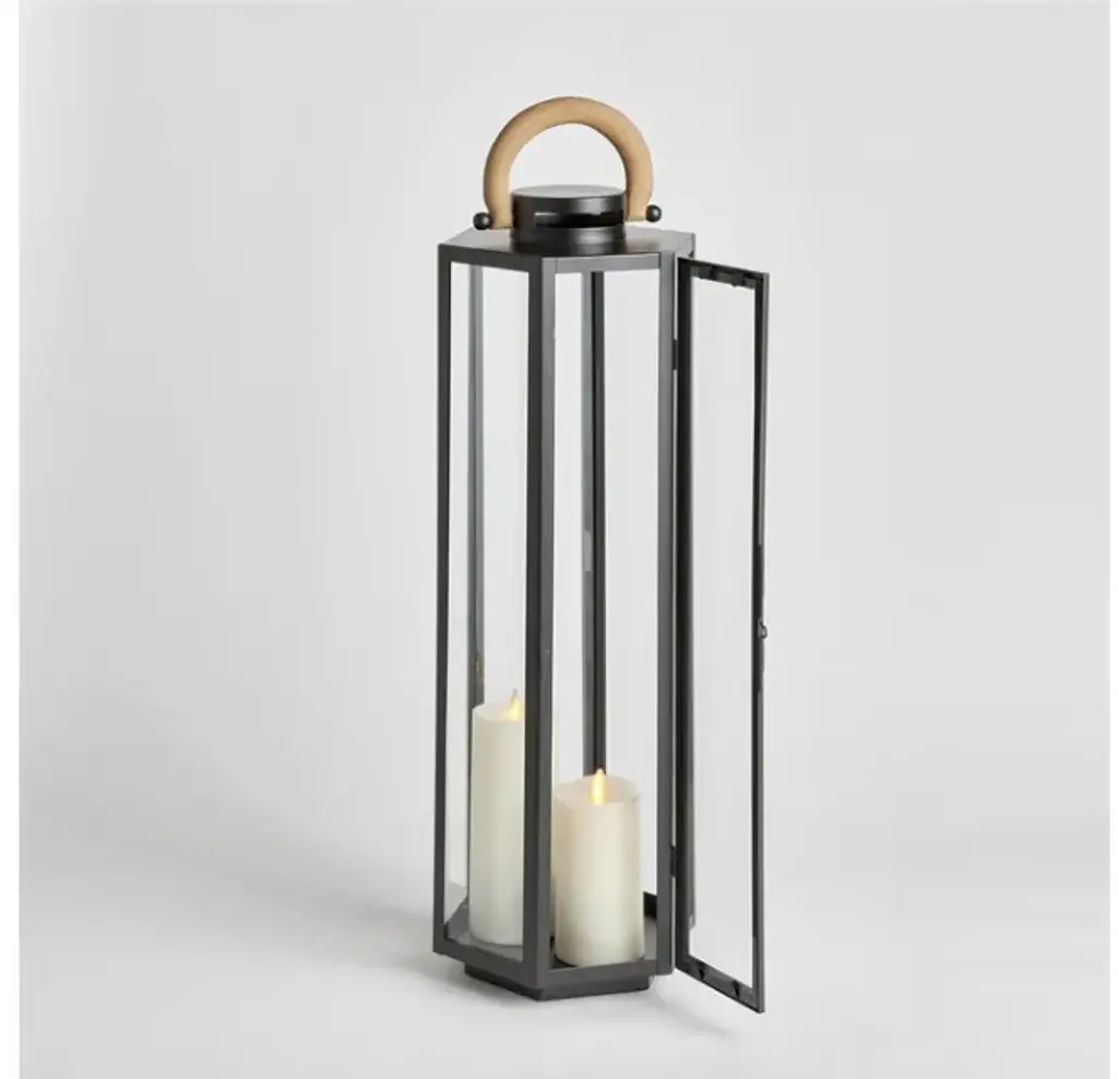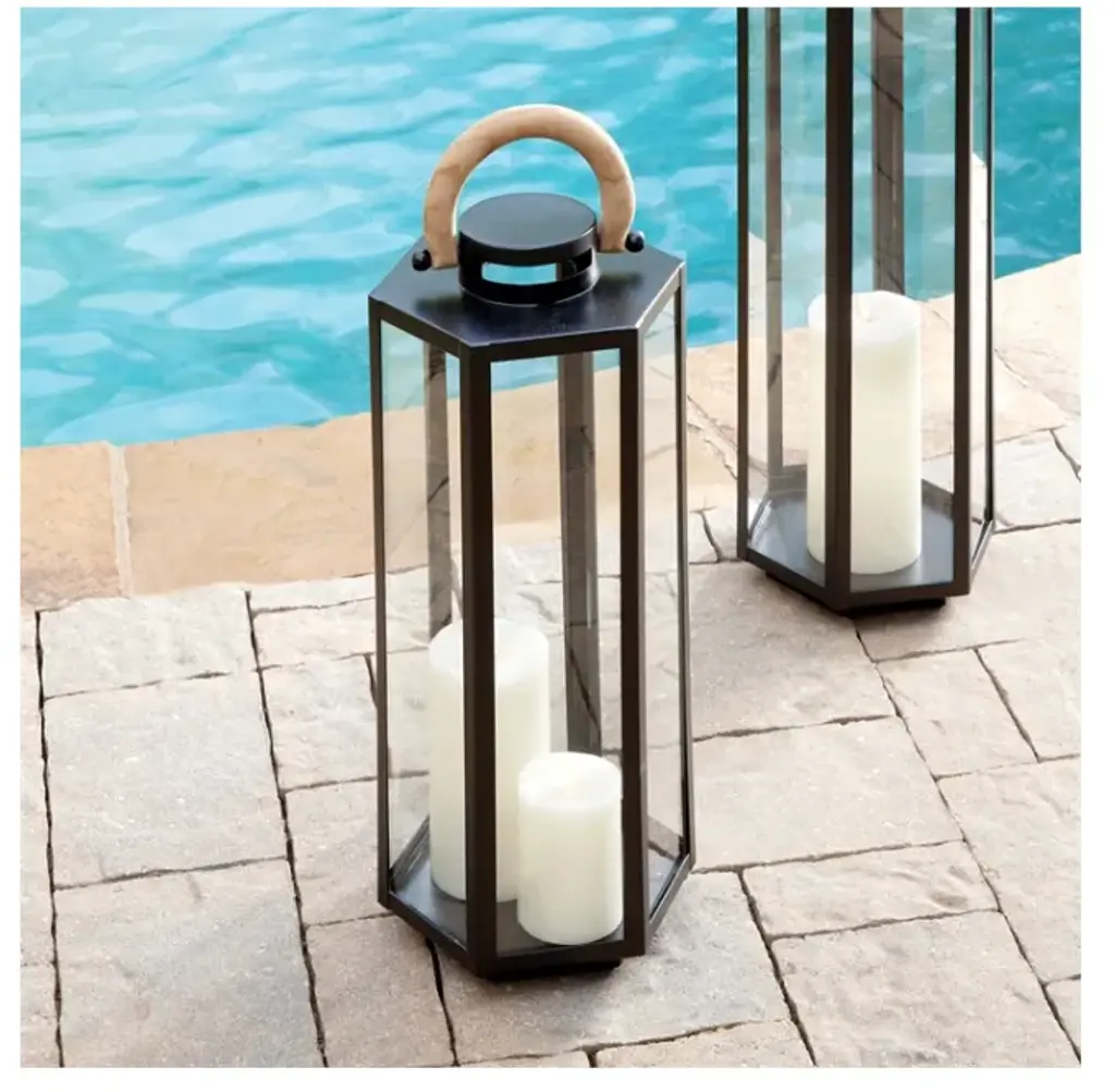 The Large Dockside Outdoor Lantern Size: 9 x 8 x 29 This matte black six panel lantern is made of iron and features a natural teak handle. Impressive in scale, it is a handsome outdoor accent by the pool, at the front entry or near your garden walk. Black powered coated & natural teak handle. Care & Use: Protect from hard freeze. Never leave a lit candle unattended. Finish will evolve with exposure to the elements. Designer floor samples & new product from one of the hottest To The Trade & Retail Home Furnishings showrooms in the country. Located in Chicago's chic Roscoe Village, Kenneth Ludwig Chicago carries the industries best furniture & accessory brands. Always fresh, always inspiring. Quite often ( due to a discontinued style, fabric or frame ) they must sell off their showroom floor samples. You receive first quality pieces at amazing prices. Check back weekly for new inventory added.