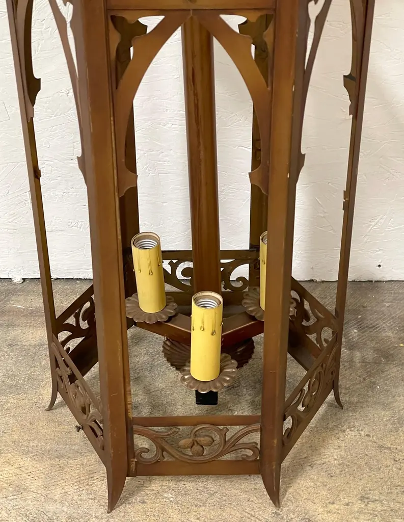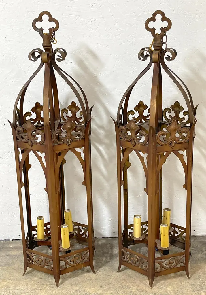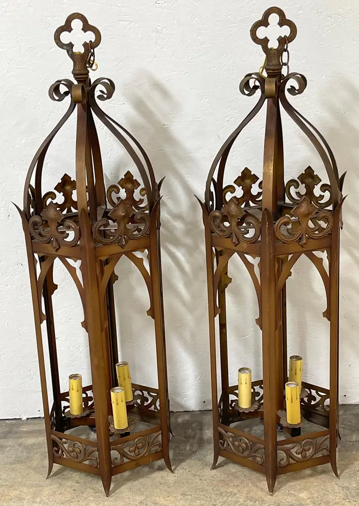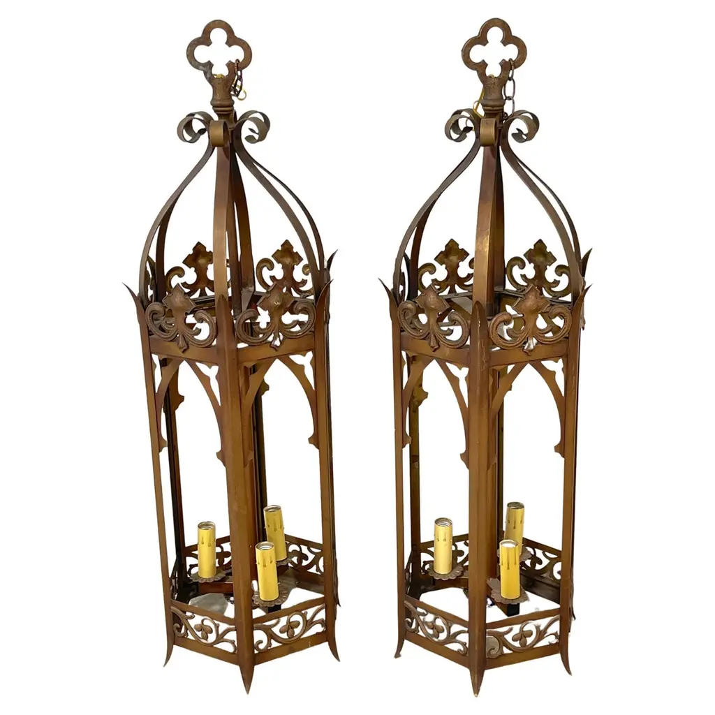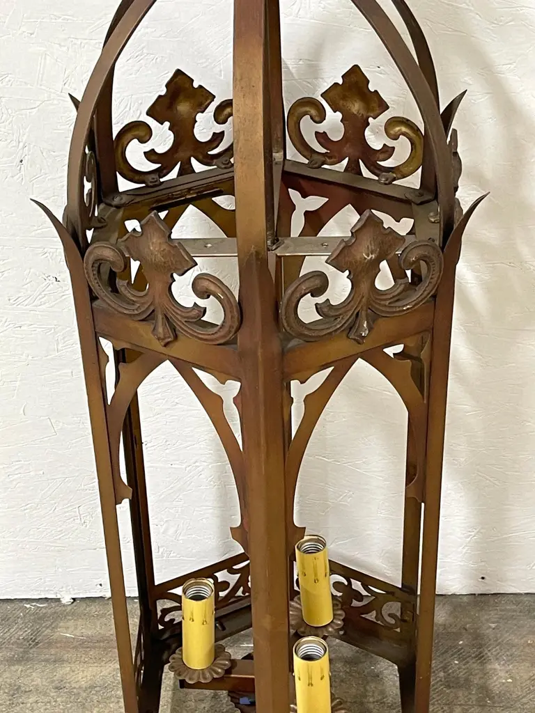 Large Patinated Gothic Style Hexagonal Lantern, RewiredSold Individually USA, circa 1920s Standing 42-Inches tall, executed in patinated metal, with Holy Cross finial, with pierced trellis decoration, fitted with three light center candelabra. Option to add glass panels if desired. Rewired, ready to place. Sold Individually, Price is for one lantern.