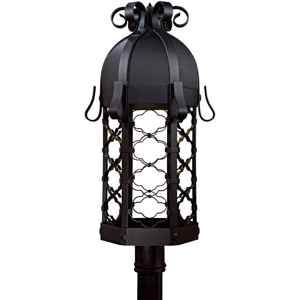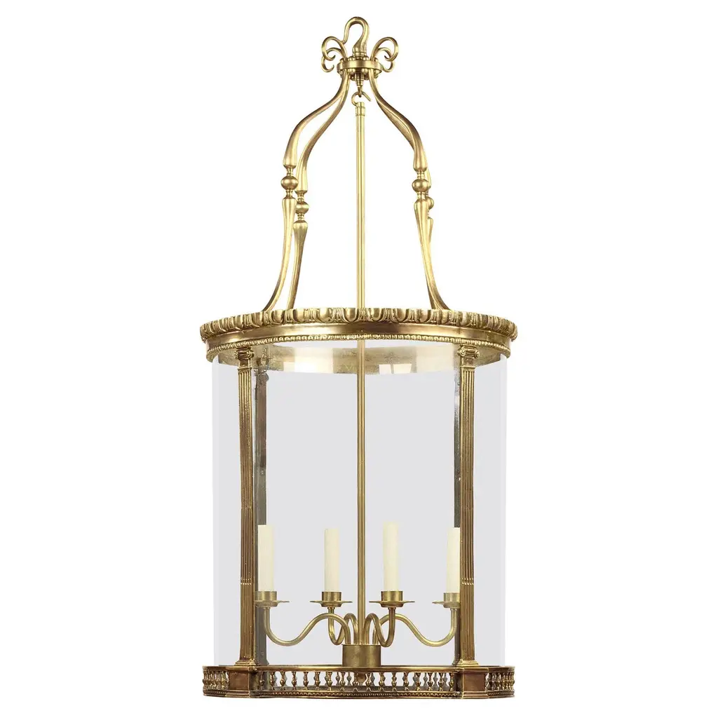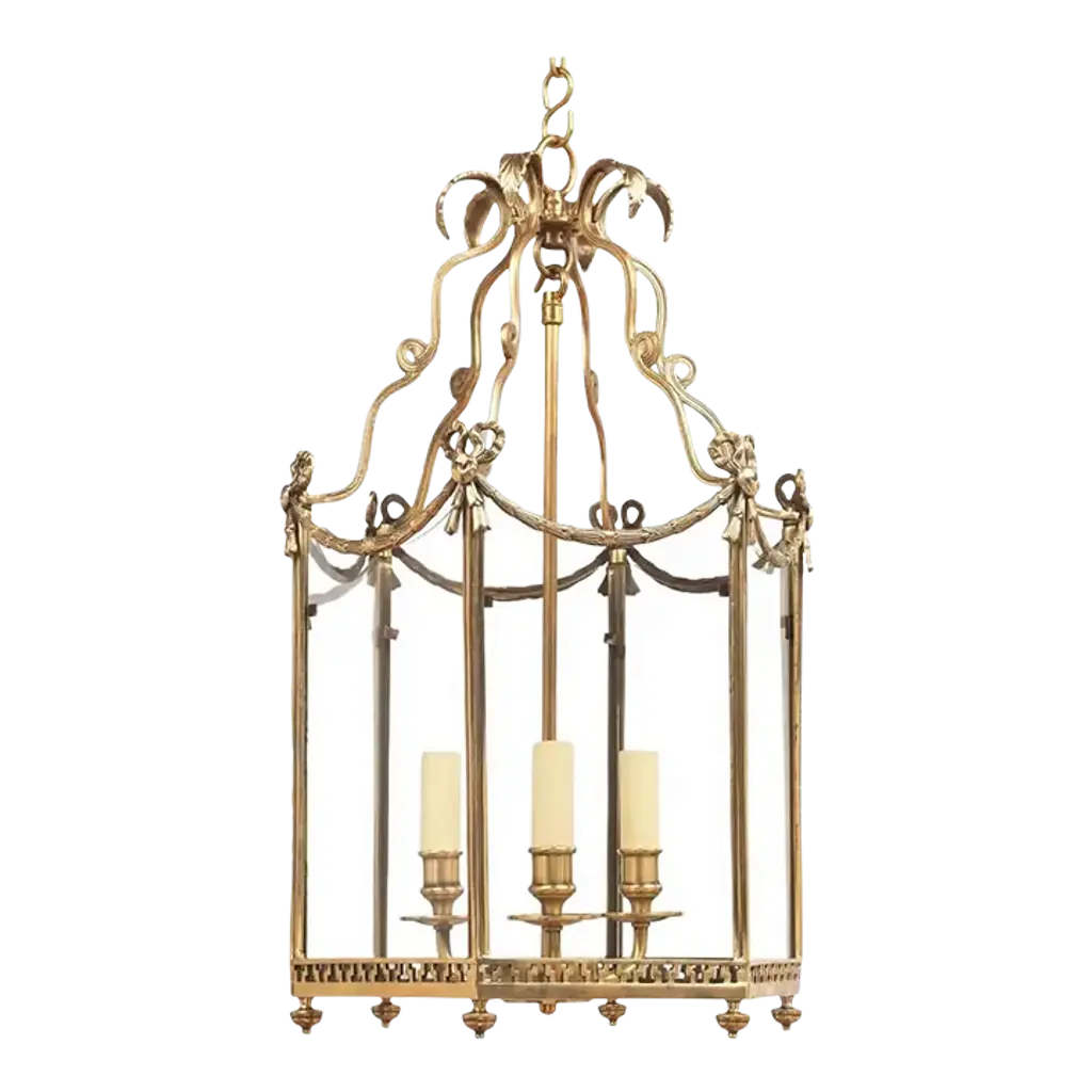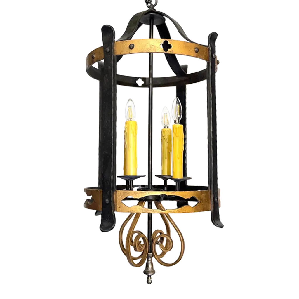 Large Patinated Gothic Style Hexagonal Lantern, RewiredSold Individually USA, circa 1920s Standing 42-Inches tall, executed in patinated metal, with Holy Cross finial, with pierced trellis decoration, fitted with three light center candelabra. Option to add glass panels if desired. Rewired, ready to place. Sold Individually, Price is for one lantern.