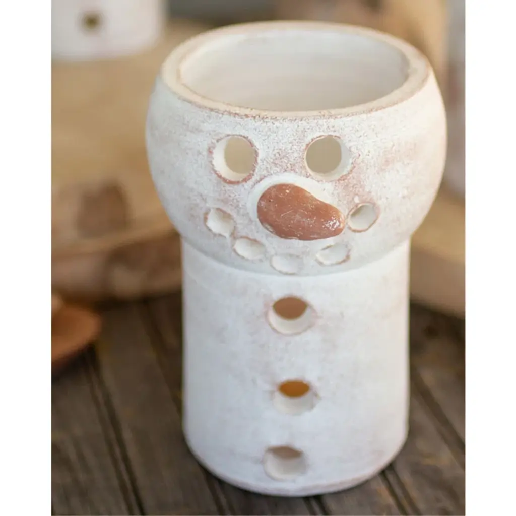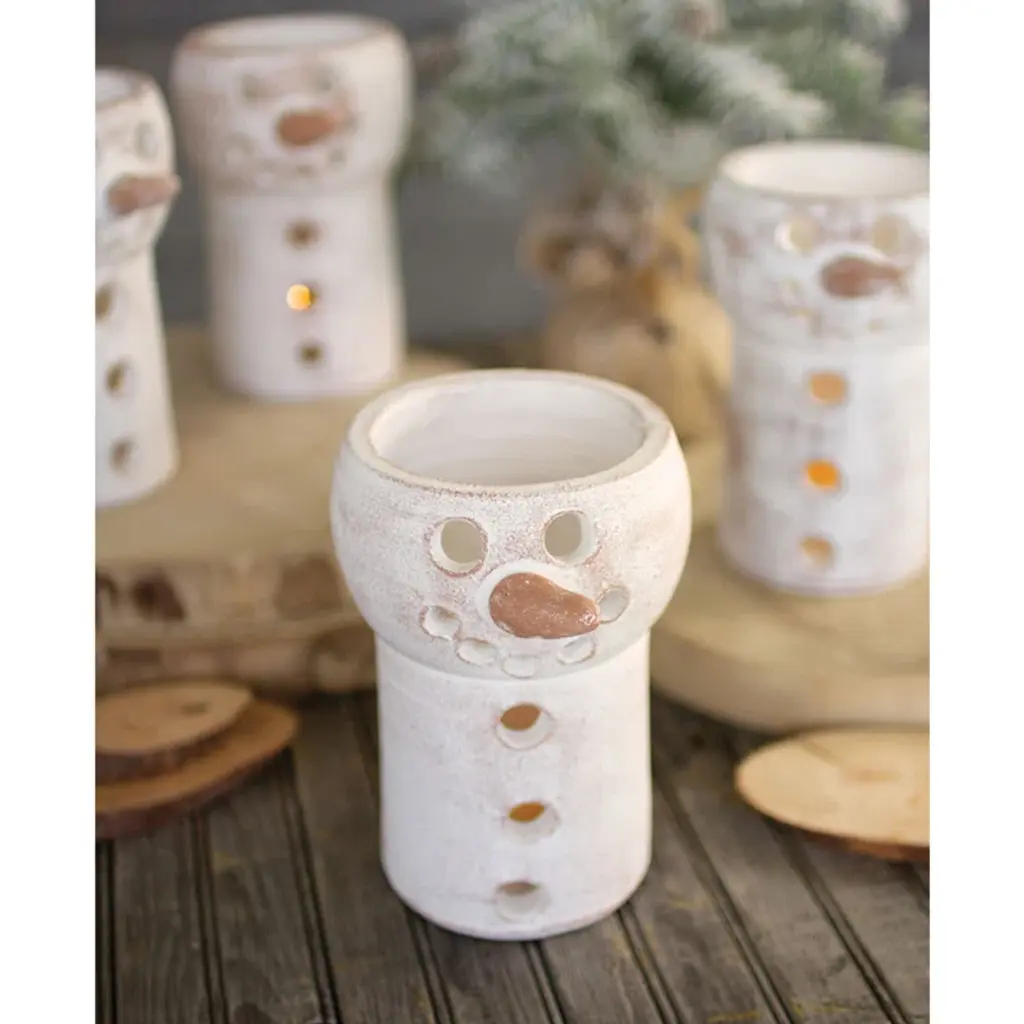 Don't let the "snow" melt away on this snowman luminary! India crafted this candle luminary out of clay and completed it with a carrot nose. The snowman is ideal for a small candle and the flame will shine bright through the buttonholes. A unique centerpiece.