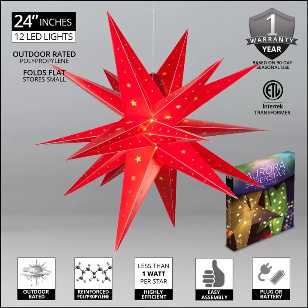 Aurora superstars combine the beauty of paper lanterns with the durability of modern materials. Made of lightweight polypropylene, this star is weatherproof, colorfast, and tear-resistant, and folds flat for easy storage. Battery-powered LED lights bring this star to life, providing a soft inner glow. Feeling creative? This star can be customized with paint or a permanent market for a truly unique look.