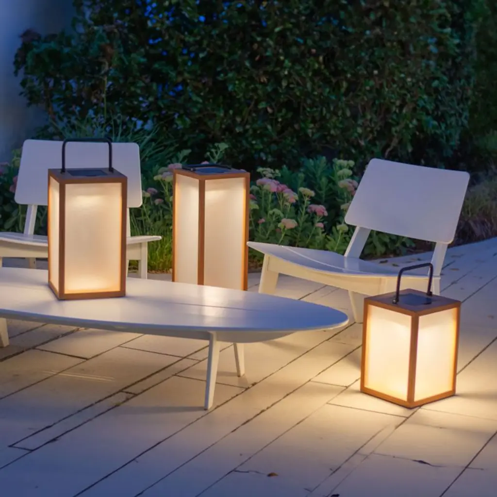 Makers of high-efficiency solar lighting, Les Jardins illuminates outdoor spaces with lanterns that deliver long-lasting light along with high style. Equipped with a solar panel seamlessly integrated into the design, this classically styled lantern frames frosted panels in rectangles of weathered teak. A stainless steel handle makes it easy to carry wherever light is neededon the front porch, the al fresco dinner table or the blanketed feast at an outdoor concert.