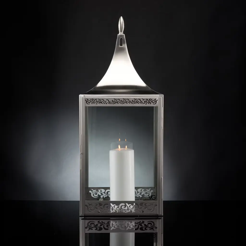 An exquisite showcase of craftsmanship, this lantern is handmade of satin-finished steel. A modern piece of ancient inspiration, it is adorned with a superb floral motif boasting strong visual and textural value enhancing its profile. The piece is equipped with a steel hook, please ask the Concierge for further details. Contract and commercial certifications available upon request.