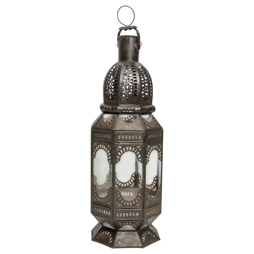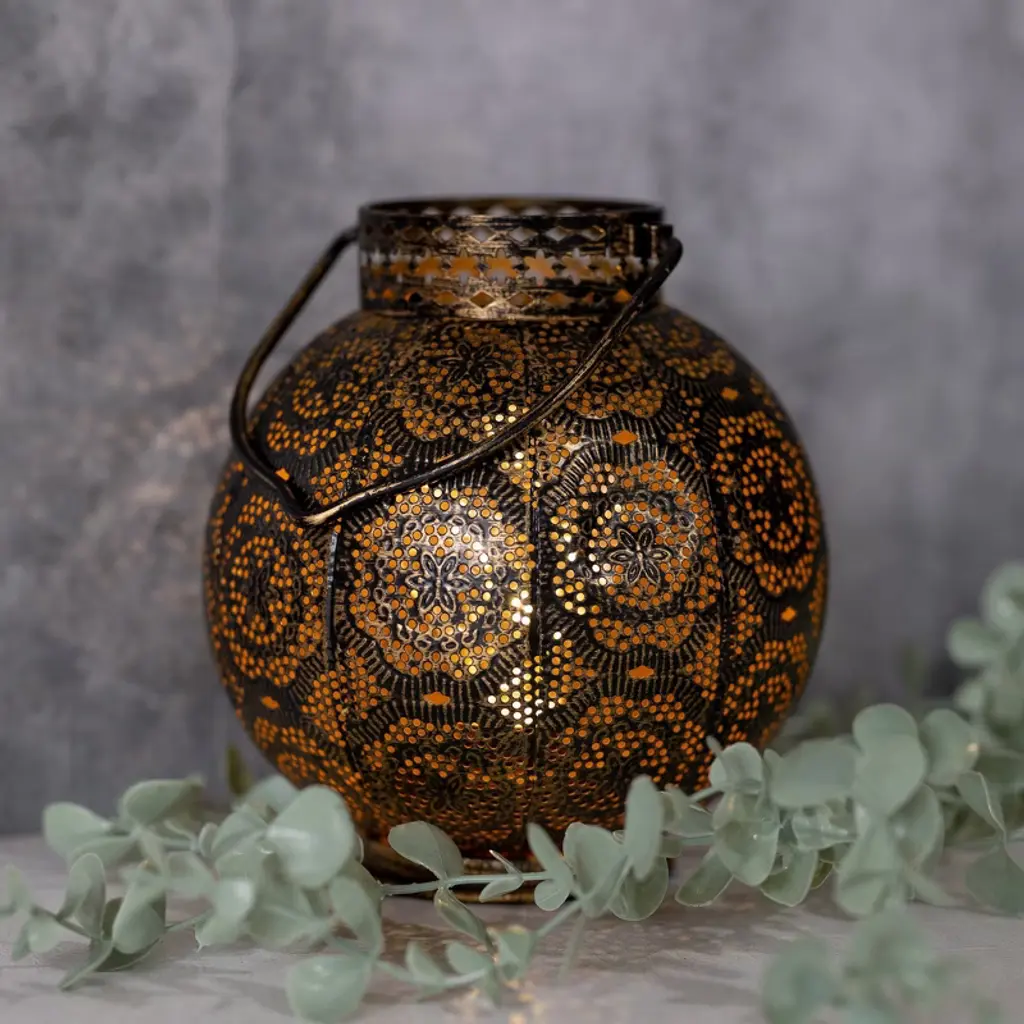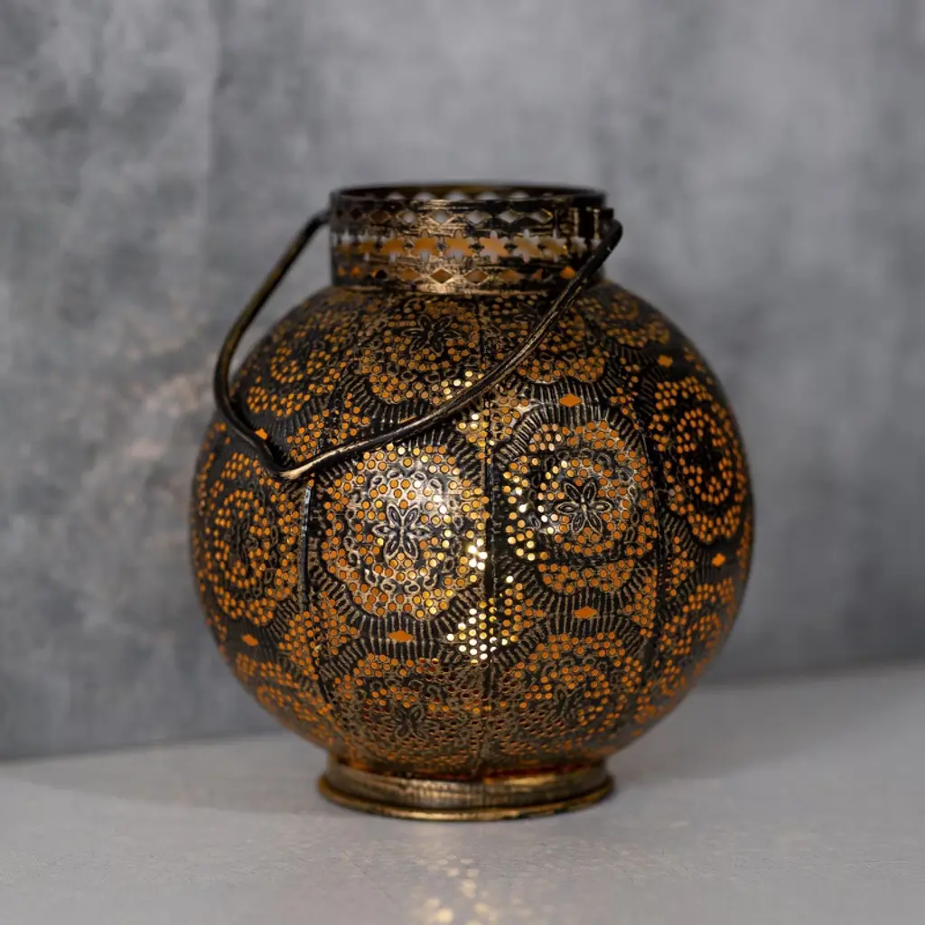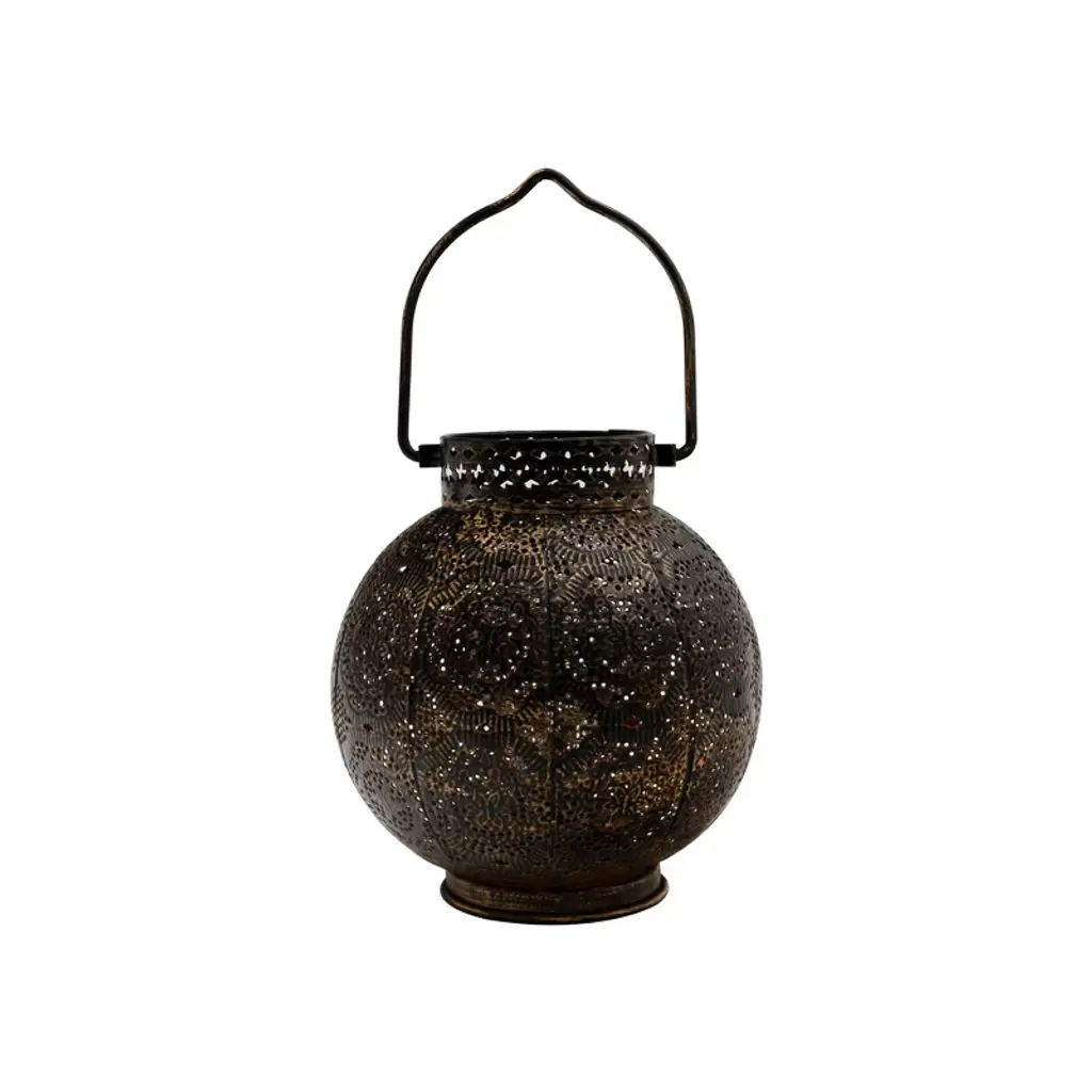 Accent your home décor with this battery-operated bronze metal lantern. This Moroccan-style round metal lantern features an intricate cut-out design with an oil-rubbed bronze finish. The interior of the lantern contains a clear, plastic lightbulb with steady, warm white fairy lights that shine through the cut-outs to cast a beautiful pattern. The lantern includes a handle, making it perfect to hang on an indoor shepherd's hook or a bracket for a wall or ceiling. You can also place the lantern on a shelf, tabletop, or floor. Flameless lanterns add lovely accent lighting to a special event, dinner party, or everyday home décor. Lantern requires 3 AAA batteries (not included).