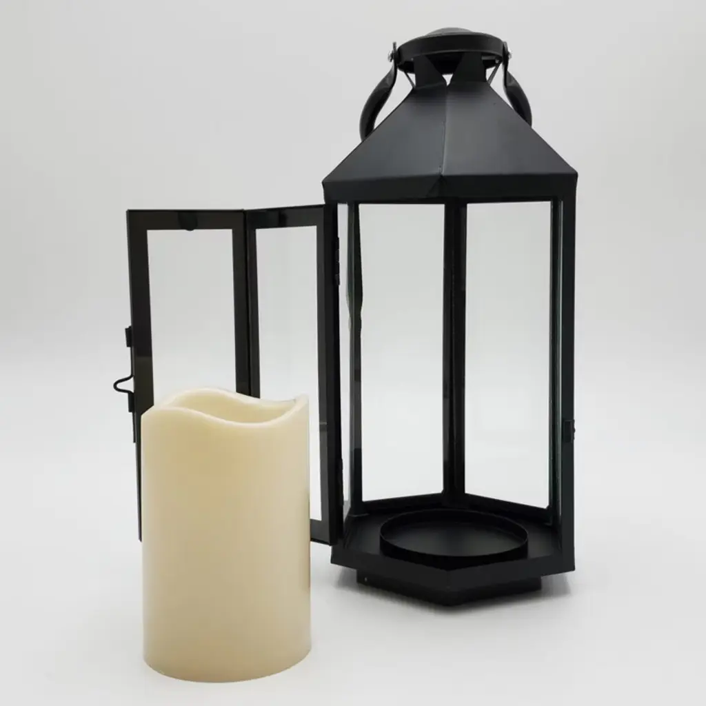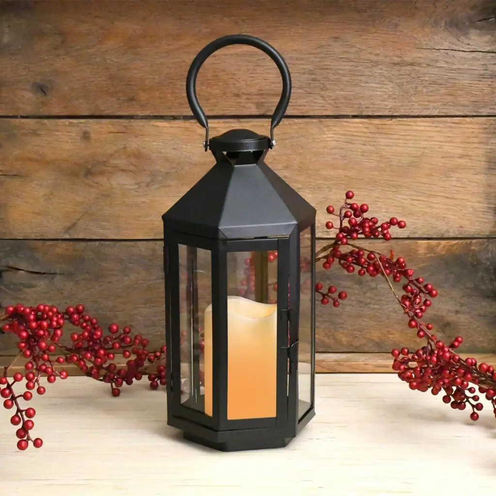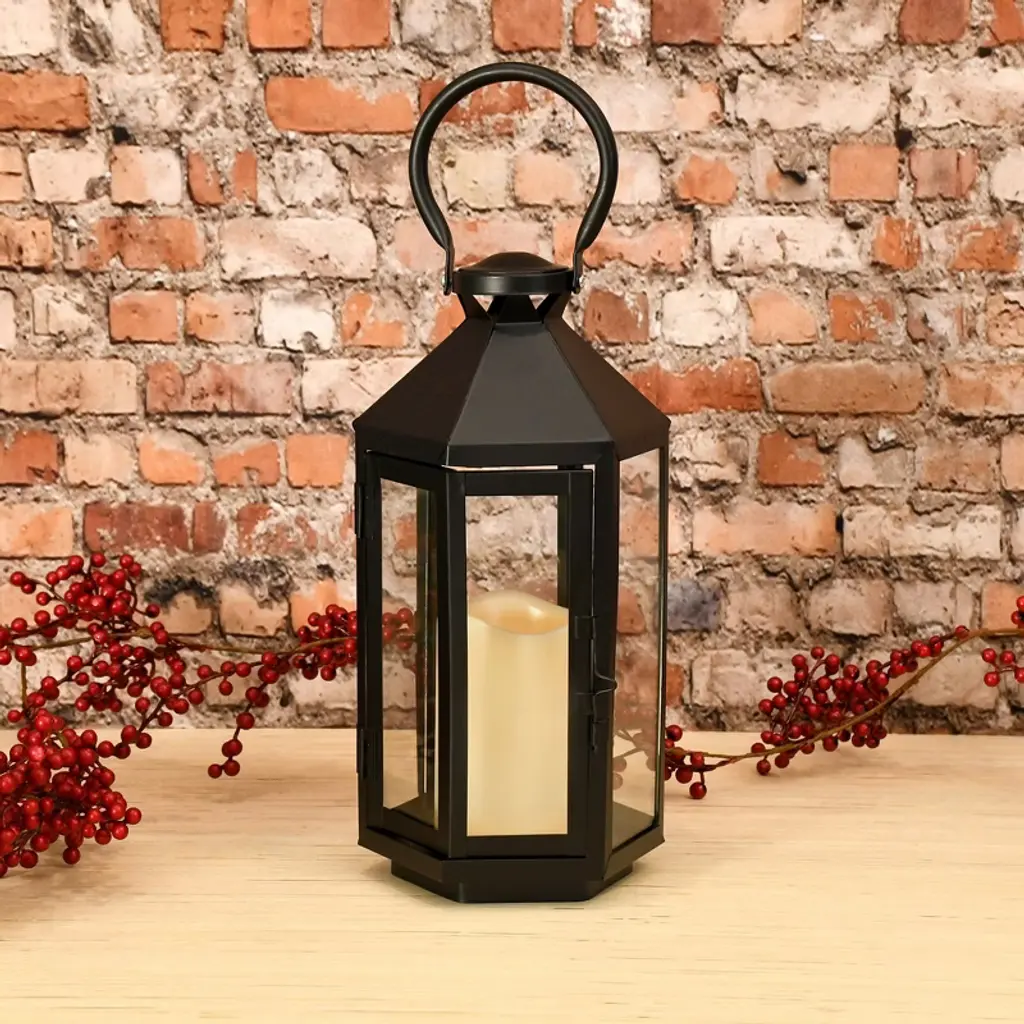 Create a warm and inviting atmosphere to your home décor with this beautiful metal lantern and battery-operated candle. The removable 4.5" LED candle provides a soft flickering amber glow that illuminates through the crystal clear tempered glass panels. Flameless lanterns add lovely accent lighting to a special event, dinner party, or everyday home décor. The lantern includes a handle, making it perfect to hang on an indoor shepherd's hook or a bracket for a wall or ceiling. The candle has a convenient timer incorporated for 5 hours on and 19 hours off. Candle requires 3 AAA batteries (not included).