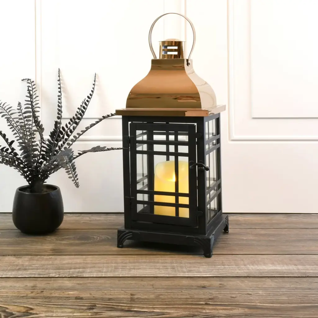 This black metal lantern with a copper roof and moving flame LED candle is a magnificent showpiece. The 4.5" LED candle includes a 5 hour timer with a flickering amber glow that illuminates through the crystal clear tempered glass panels. The flameless candle provides the beautiful look of a real candle. The removable candle allows the use of a wax pillar or LED fairy string lights. The battery-operated wireless illumination is safe for indoor tabletops, seating areas, centerpieces, and so much more. The loop on top of the roof allows this lantern to suspend from a wall, ceiling, or shepherd’s hook. Candle requires 3 AAA batteries (not included). Your browser does not support our video.