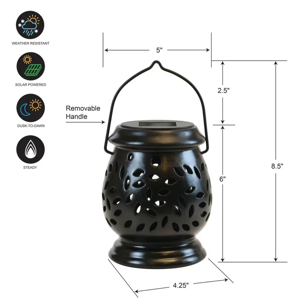Charged by the sun, this solar-powered lantern will highlight the look of your outdoor décor from dusk until dawn. The cool white LED light adds brilliant illumination through the leaf-shape openings, creating unique lighting. Keep lantern in a sunny area every day to charge the panel for nighttime illumination. The lantern has a removable handle, perfect for adding ambient lighting to an outdoor table. Use with the handle to hang from a shepherd’s hook to display along a walkway, garden, or patio.