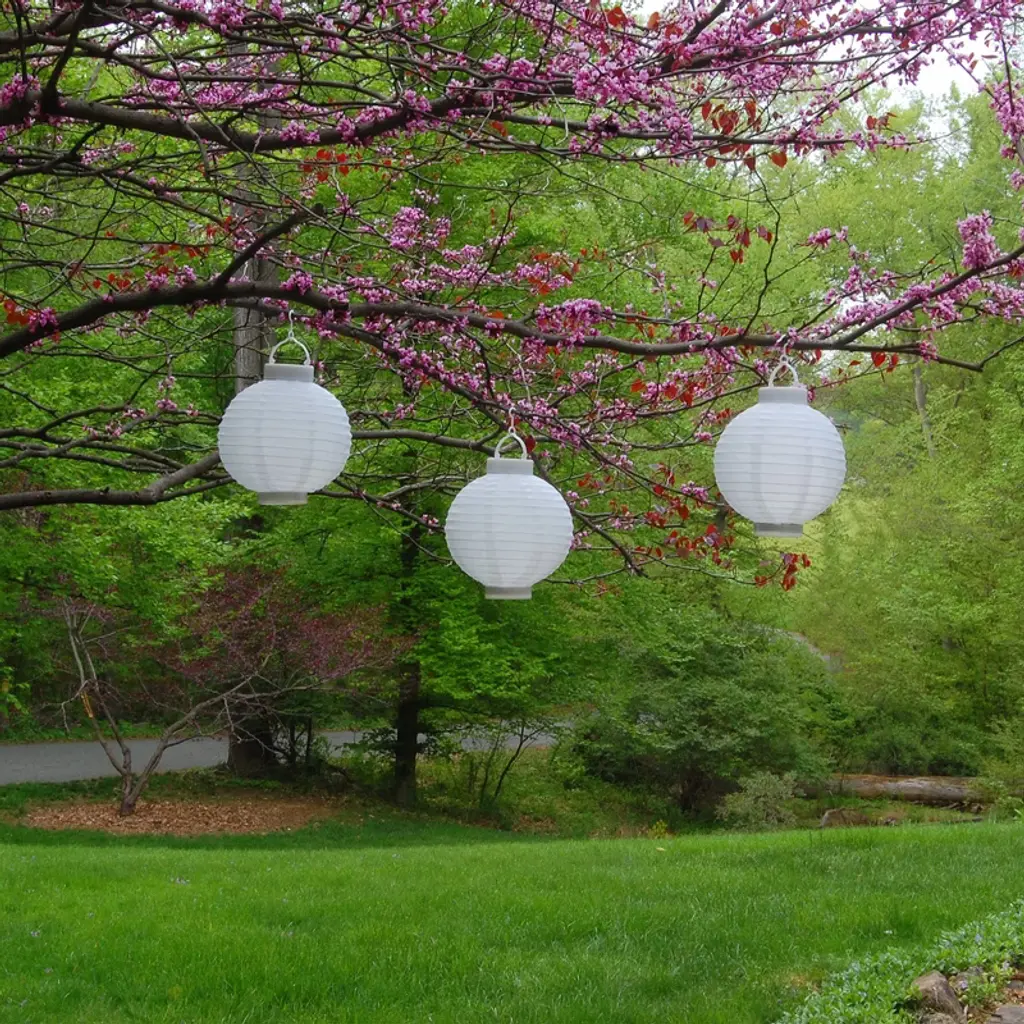 Add a sophisticated touch to your outdoor décor with this set of three round solar-powered lanterns. These 8" lanterns are not limited with cords or plugs, so you can hang them anywhere outside to perfectly accent your outdoor surroundings. Each lantern has a built-in solar panel, an on/off switch, and comes with one AA-Ni-MH-300 battery. The solar panel collects direct sunlight all day and will glow for 6-7 hours at sunset. The lanterns are constructed of white nylon and are collapsible and portable.