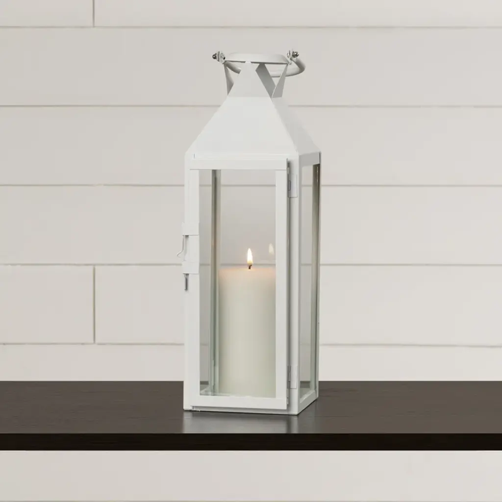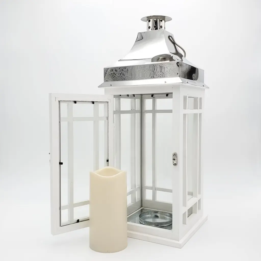This beautiful white wooden lantern with a chrome roof and removable LED candle will create a stunning look to your décor. It will easily brighten up any occasion, event, or everyday home décor. The 6" battery-operated candle inside the lantern provides lovely ambient lighting. The light source has a convenient timer incorporated with 5 hours on/19 hours off. Candle requires 3 AAA batteries (not included).