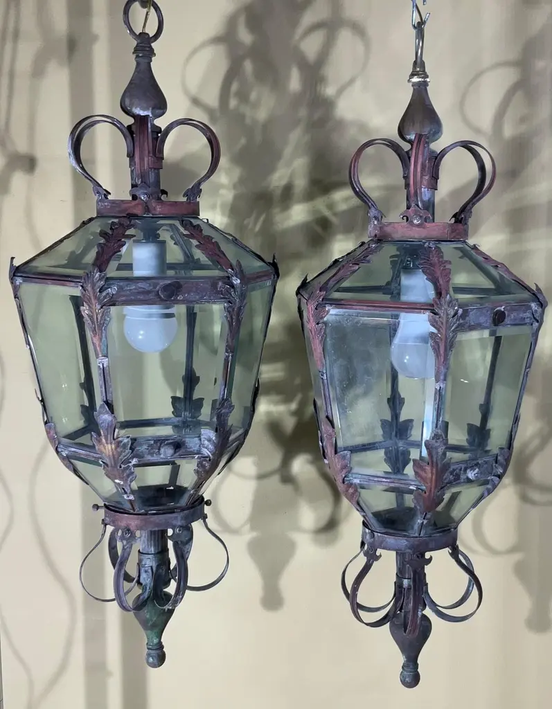 Are you looking to add a touch of vintage charm and sophistication to your home or outdoor space? Look no further than this exquisite pair of vintage brass hanging lanterns! These stunning fixtures are sure to captivate attention and create a warm, inviting ambiance. Crafted with meticulous attention to detail, these lanterns showcase intricate brass work and ornate designs, beveled glass , with one new porcelain socket light each lantern The brass has developed a beautiful patina over time, adding to the vintage appeal and character.The classic lantern shape with a crown-like top exudes timeless elegance.Versatile Use: Perfect for both indoor and outdoor settings, these lanterns can be hung in foyers, dining rooms, patios, or porches.These vintage lanterns are in good condition with minimal signs of wear. They have been well-maintained and are ready to illuminate your space for years to Chain and canopies are included