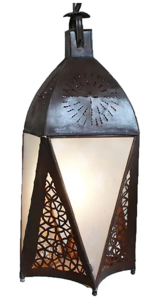 Vintage hand crafted Moroccan pendant lantern with frosted white glass panels and dark rust/black finish metal frame. Hand cut perforated details. Each may vary in exact patina and handmade detail. Includes 3' chain and black ceiling plate. 100 watt max fixture. Bulb not included.