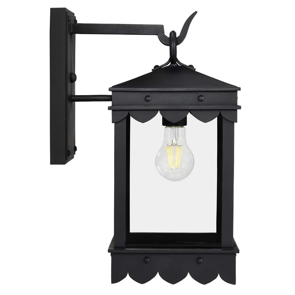 Our De La Guerra lantern has Mediterranean style precedence with historic profiles and contemporary geometric lines. A striking fixture during the day but even more so at night when the patterned hem casts intricate shadows. The 04 is the square version of the classic De La Guerra Lantern. Hand forged in heavy gauge iron.Backplate dimensions (inches): 5 W x 9 H.Lantern shown in SBLC Old World Finish with SBLC Antique Glass. Hand-forged in heavy gauge wrought iron. All lanterns go through a metalizing process, a protective zinc layer added to ensure protection and durability against corrosion and harsh weather conditions.All lights are handmade and made to order. Dimensions may vary slightly.All lights ship with 5w LED Edison dimmable filament bulb.This lantern will ship within 8-10 weeks. Larger orders may have longer lead times. As with any handcrafted product, slight discrepancies are inherent in the art of forged iron, and even considered desirable as they indicate our old-world craftsmanship. Natural variations in tone, texture, and color may occur as our finishes are hand painted.