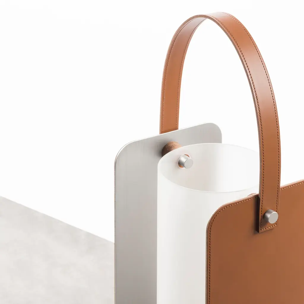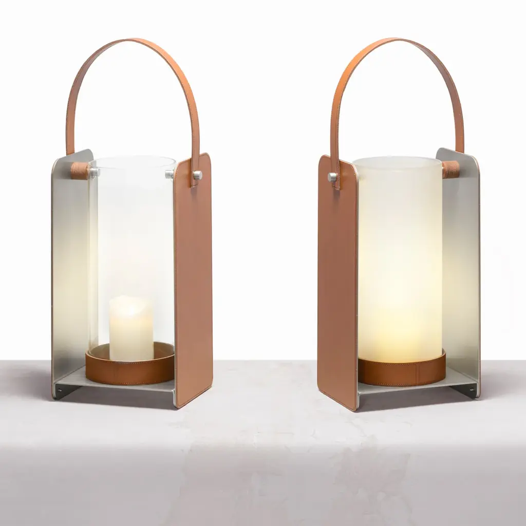 Aluminum structure featuring a saddle leather decorative external cover and a space to host a borosilicate glass tube. Please, contact the Concierge for further information.