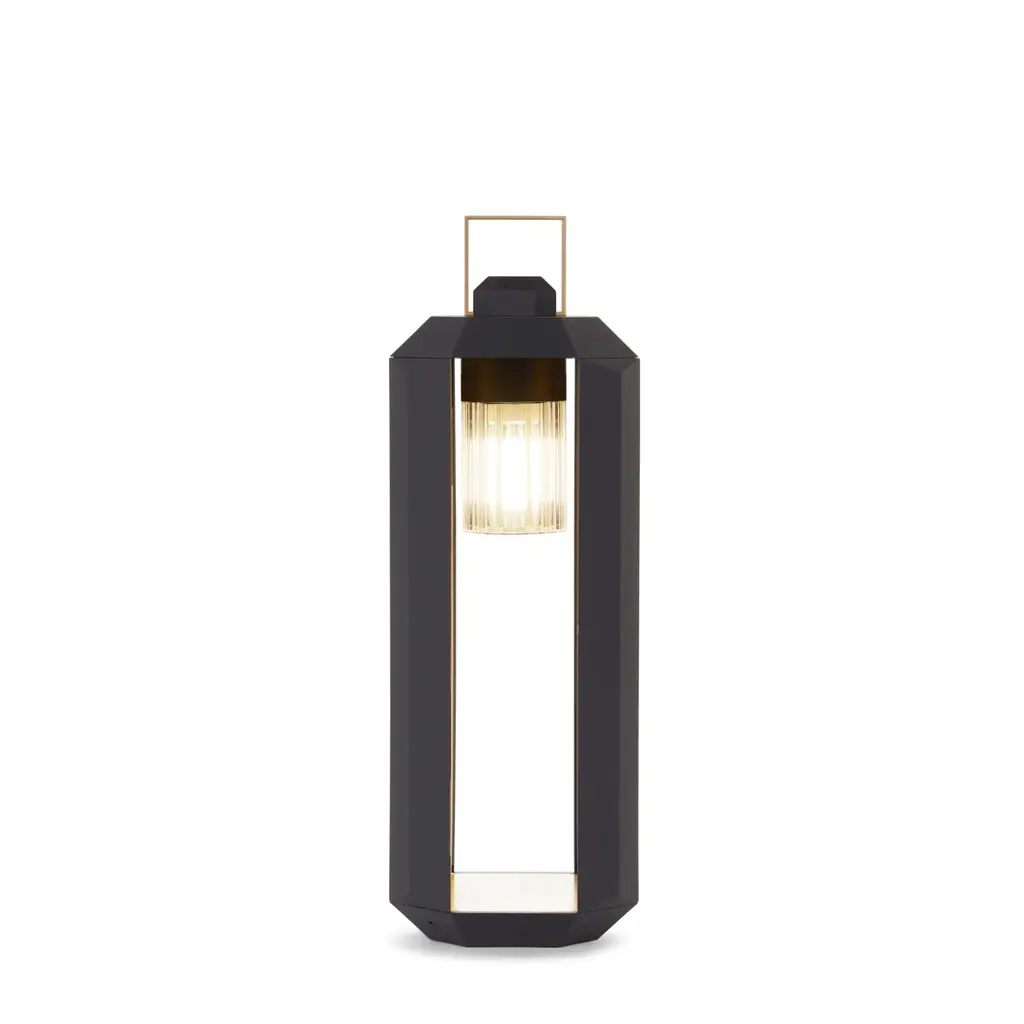 Elevate your outdoor space with Contardi Cube, a metal-framed lantern designed for both style and function. The rechargeable battery or cabled versions offer a sophisticated ignition system without a switch. Enjoy the convenience of recharging with a simple rotation, all while adding a touch of luxury with the light bronze exterior and satin gold interior.
