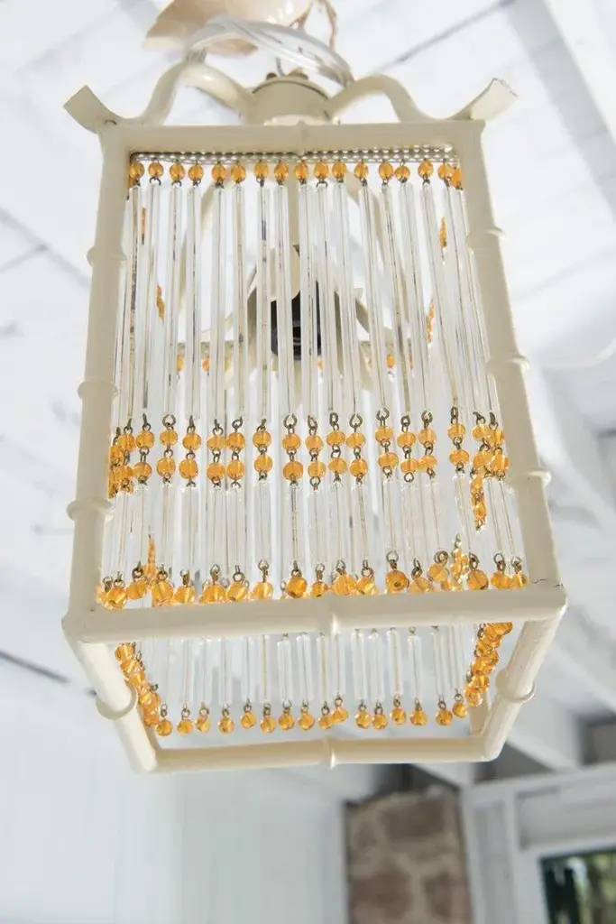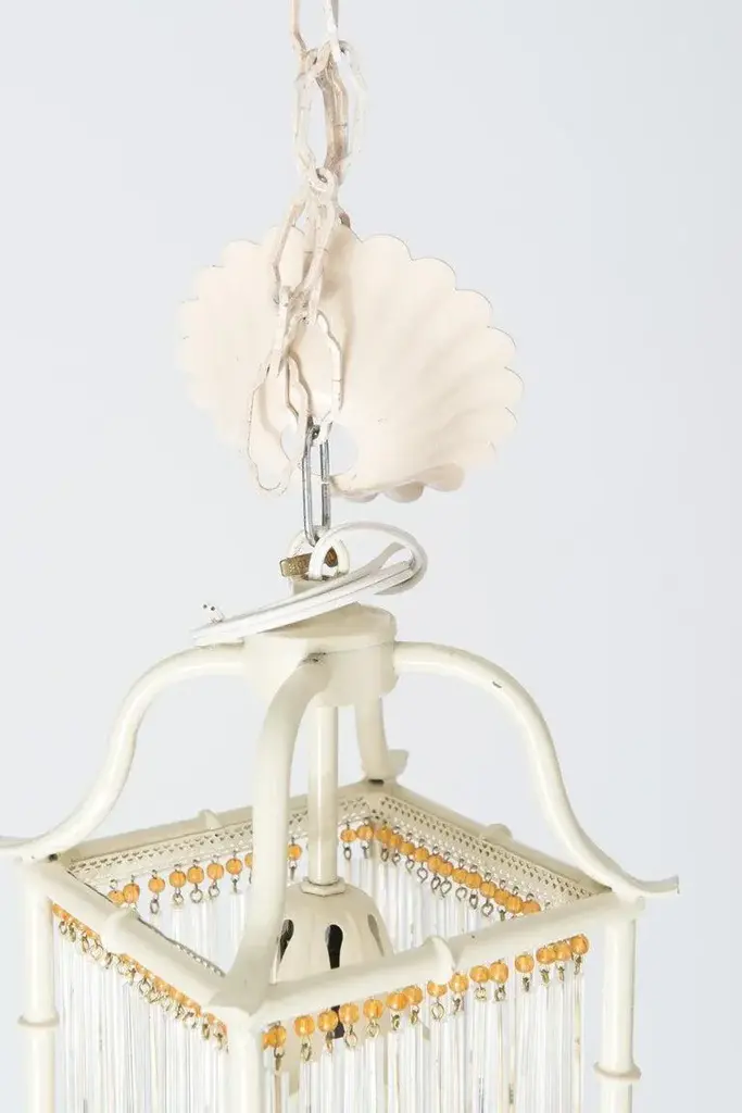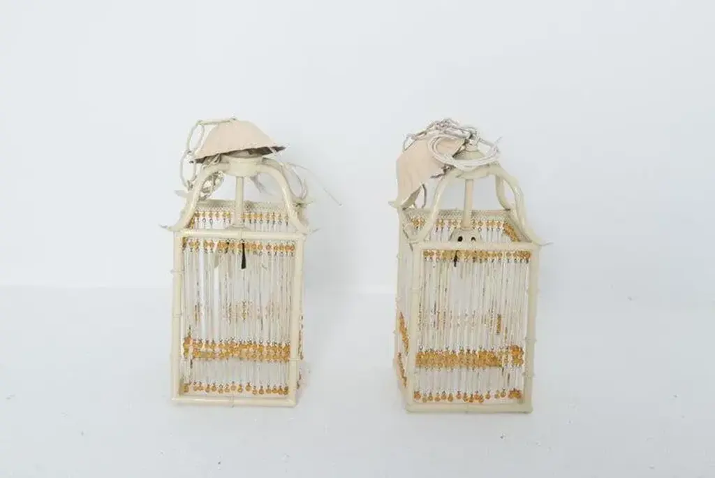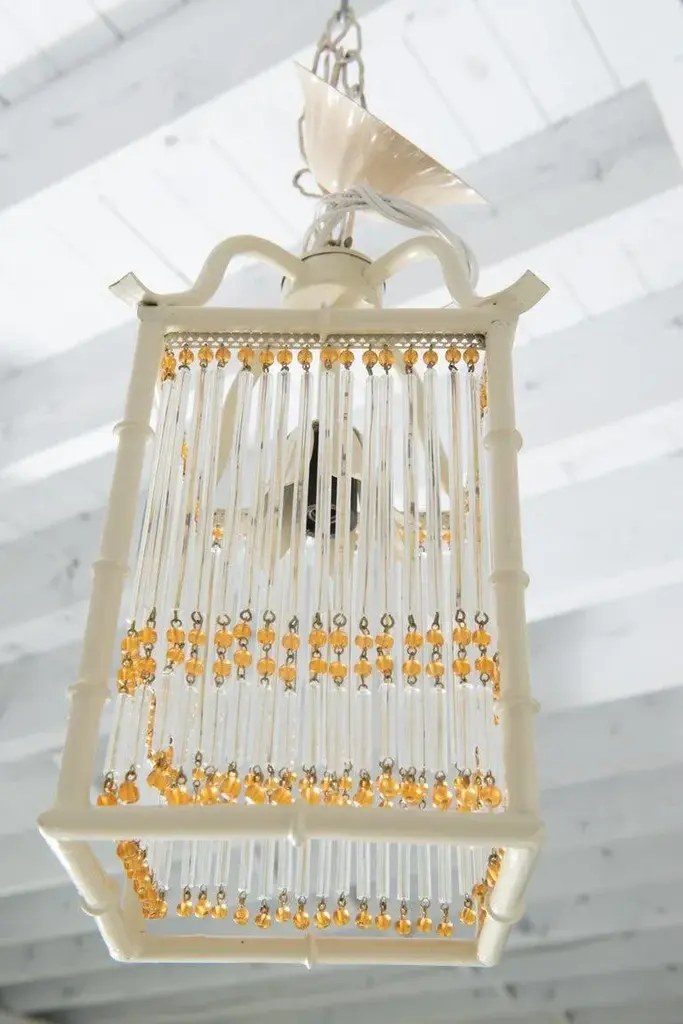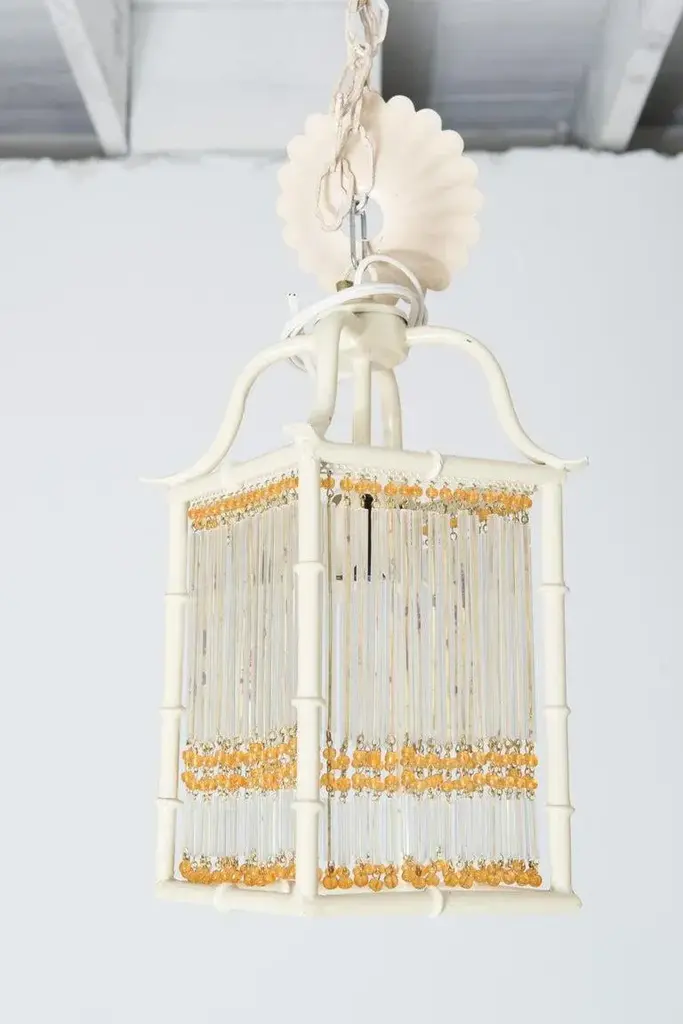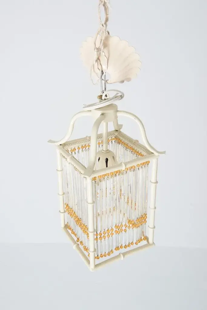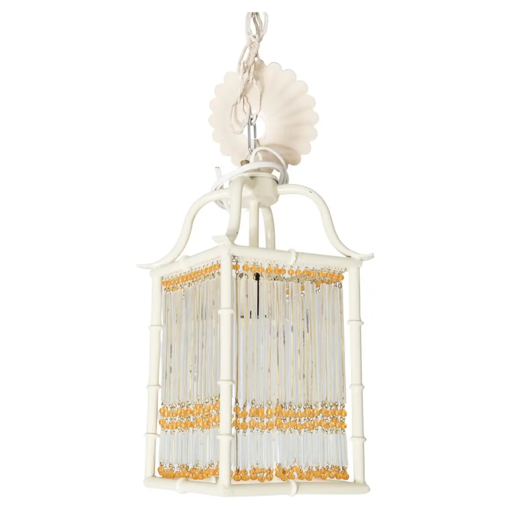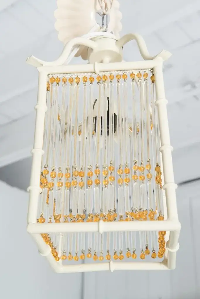 This is a pair of small Pagoda style faux bamboo white painted metal lanterns. Each Chinoiserie lantern has gold color glass beads and clear glass rods decorating the four flat open sides of the lantern. The original canopies are included. The lanterns have one light socket each. These lanterns are new, unused old stock. They can be considered Hollywood Regency style as well as modern. The rectangular body is 6" square and 8.5" high. Price listed is per item.